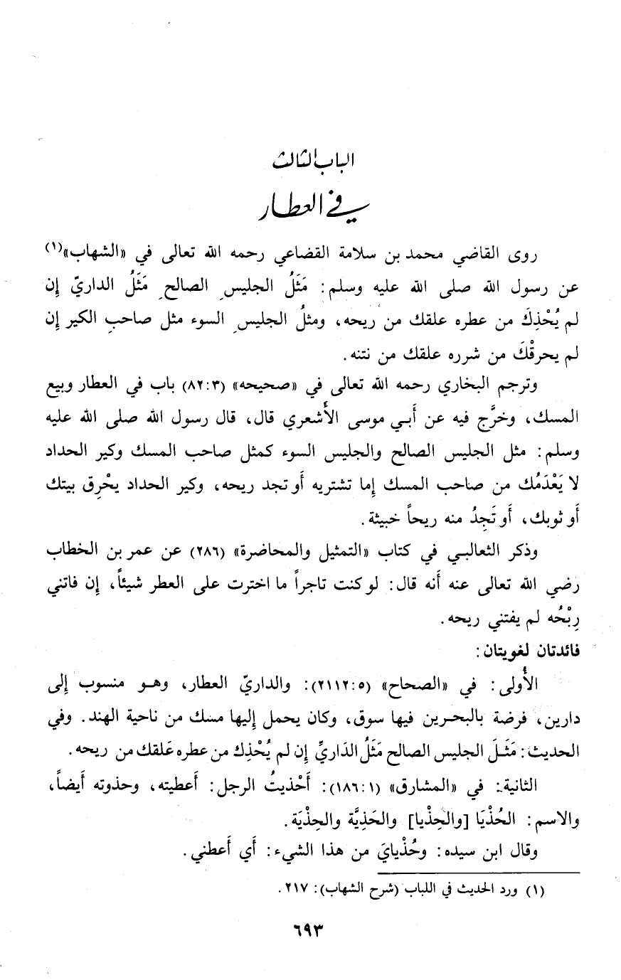 وترجم البخاري رحمه الله تعالى في «صحيحه» (3: 82) باب في العطار وبيع المسك، وخرّج فيه عن أبي موسى الأشعري قال، قال رسول الله صلّى الله عليه وسلم: مثل الجليس الصالح والجليس السوء كمثل صاحب المسك وكير الحداد لا يعدمك من صاحب المسك إما تشتريه أو تجد ريحه، وكير الحداد يحرق بيتك أو ثوبك، أو تجد منه ريحا خبيثة.