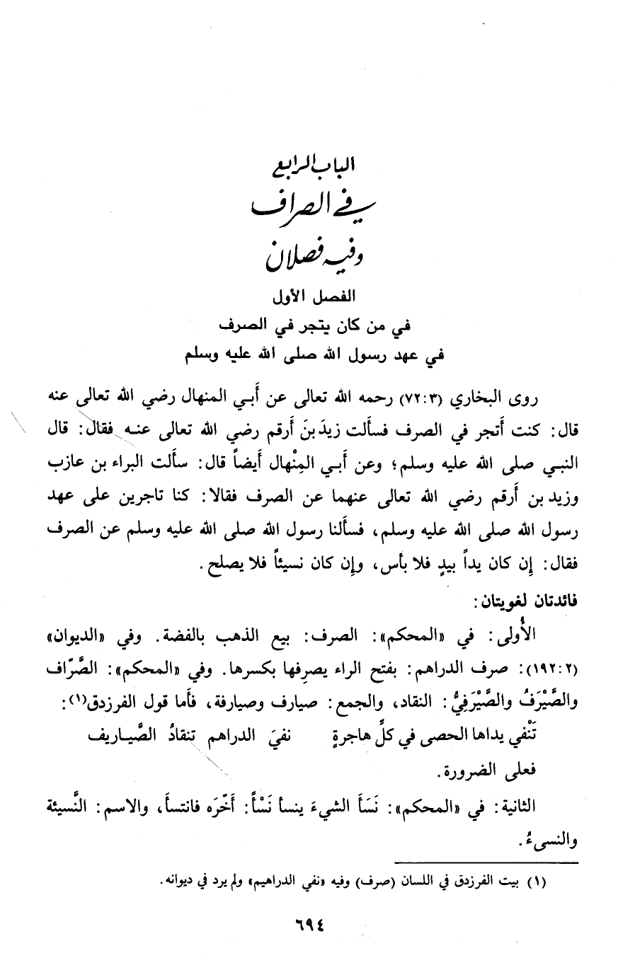 روى البخاري (3: 72) رحمه الله تعالى عن أبي المنهال رضي الله تعالى عنه قال: كنت أتجر في الصرف فسألت زيد بن أرقم رضي الله تعالى عنه فقال: قال النبي صلّى الله عليه وسلم؛ وعن أبي المنهال أيضا قال: سألت البراء بن عازب وزيد بن أرقم رضي الله تعالى عنهما عن الصرف فقالا: كنا تاجرين على عهد رسول الله صلّى الله عليه وسلم، فسألنا رسول الله صلّى الله عليه وسلم عن الصرف فقال: إن كان يدا بيد فلا بأس، وإن كان نسيئا فلا يصلح.