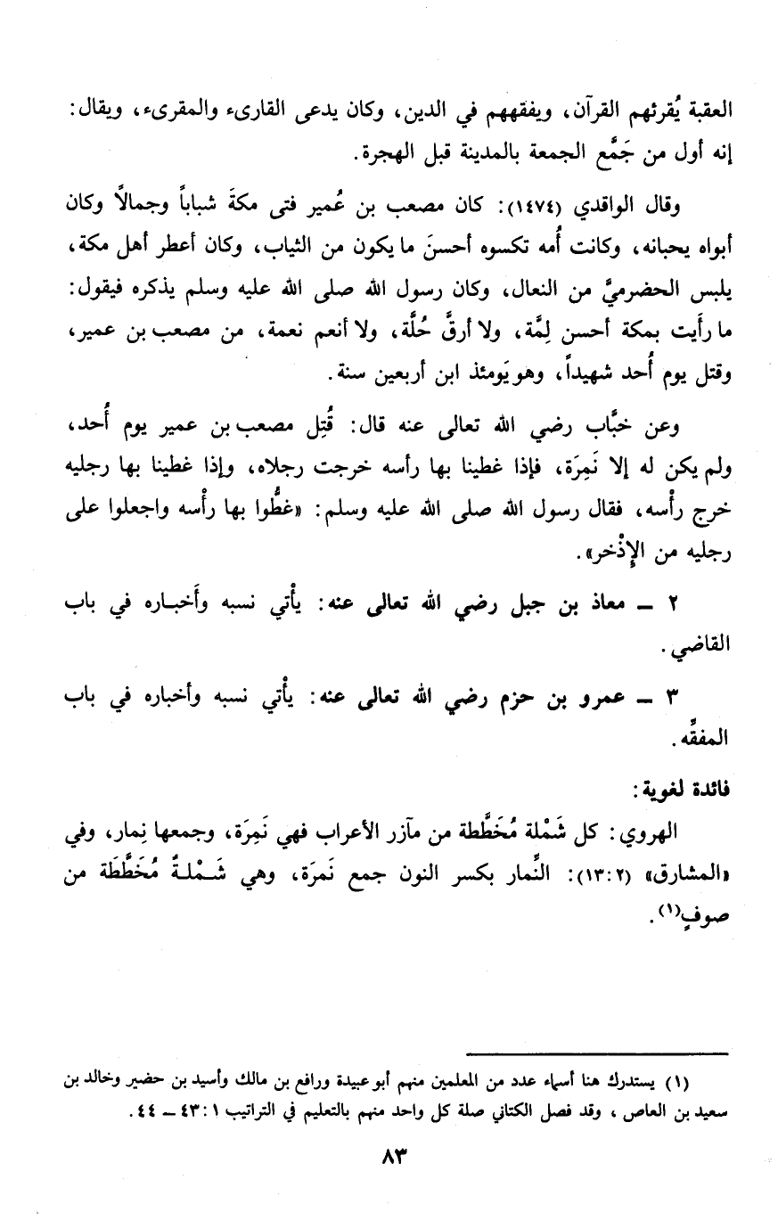 (1) يستدرك هنا أسماء عدد من المعلمين منهم أبو عبيدة ورافع بن مالك وأسيد بن حضير وخالد بن سعيد بن العاص، وقد فصل الكتاني صلة كل واحد منهم بالتعليم في التراتيب 1: 43- 44.