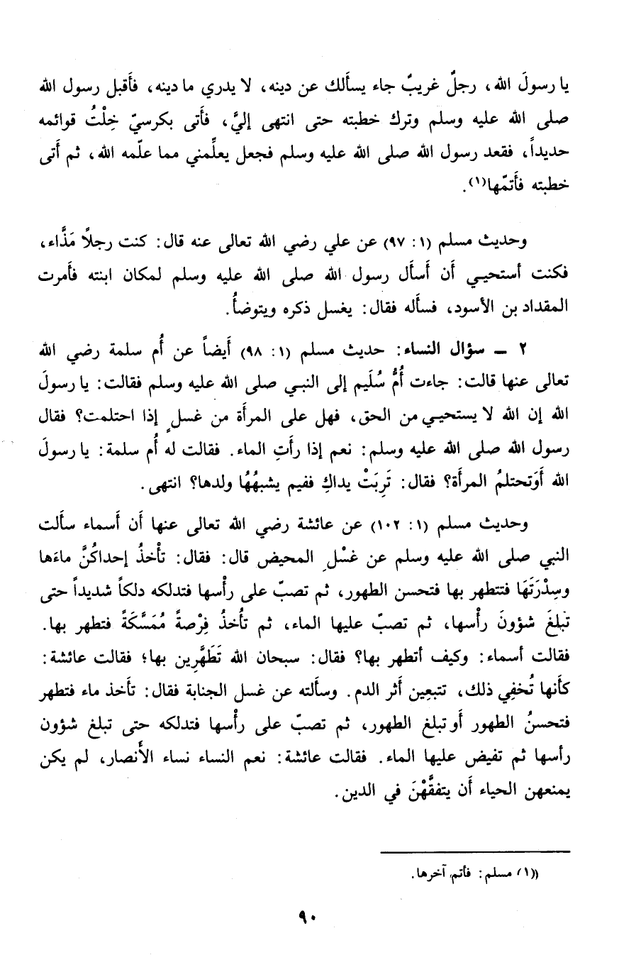 حديث مسلم (1: 98) أيضا عن أم سلمة رضي الله تعالى عنها قالت: جاءت أمّ سليم إلى النبي صلّى الله عليه وسلم فقالت: يا رسول الله إن الله لا يستحيي من الحق، فهل على المرأة من غسل إذا احتملت؟ فقال رسول الله صلّى الله عليه وسلم: نعم إذا رأت الماء. فقالت له أم سلمة: يا رسول الله أو تحتلم المرأة؟ فقال: تربت يداك ففيم يشبهها ولدها؟ انتهى.