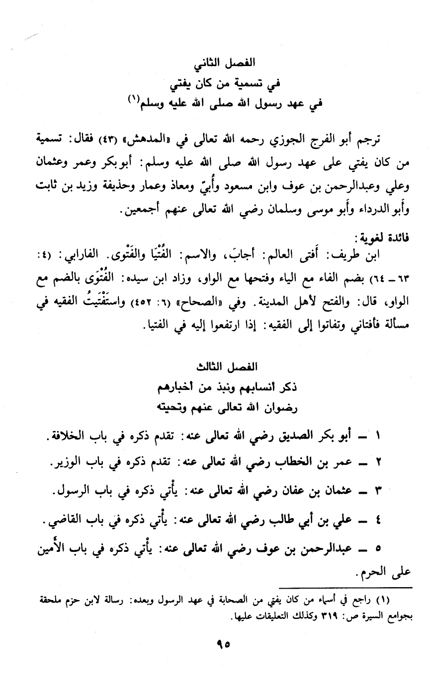 (1) راجع في أسماء من كان يفتي من الصحابة في عهد الرسول وبعده: رسالة لابن حزم ملحقة بجوامع السيرة ص: 319 وكذلك التعليقات عليها.
