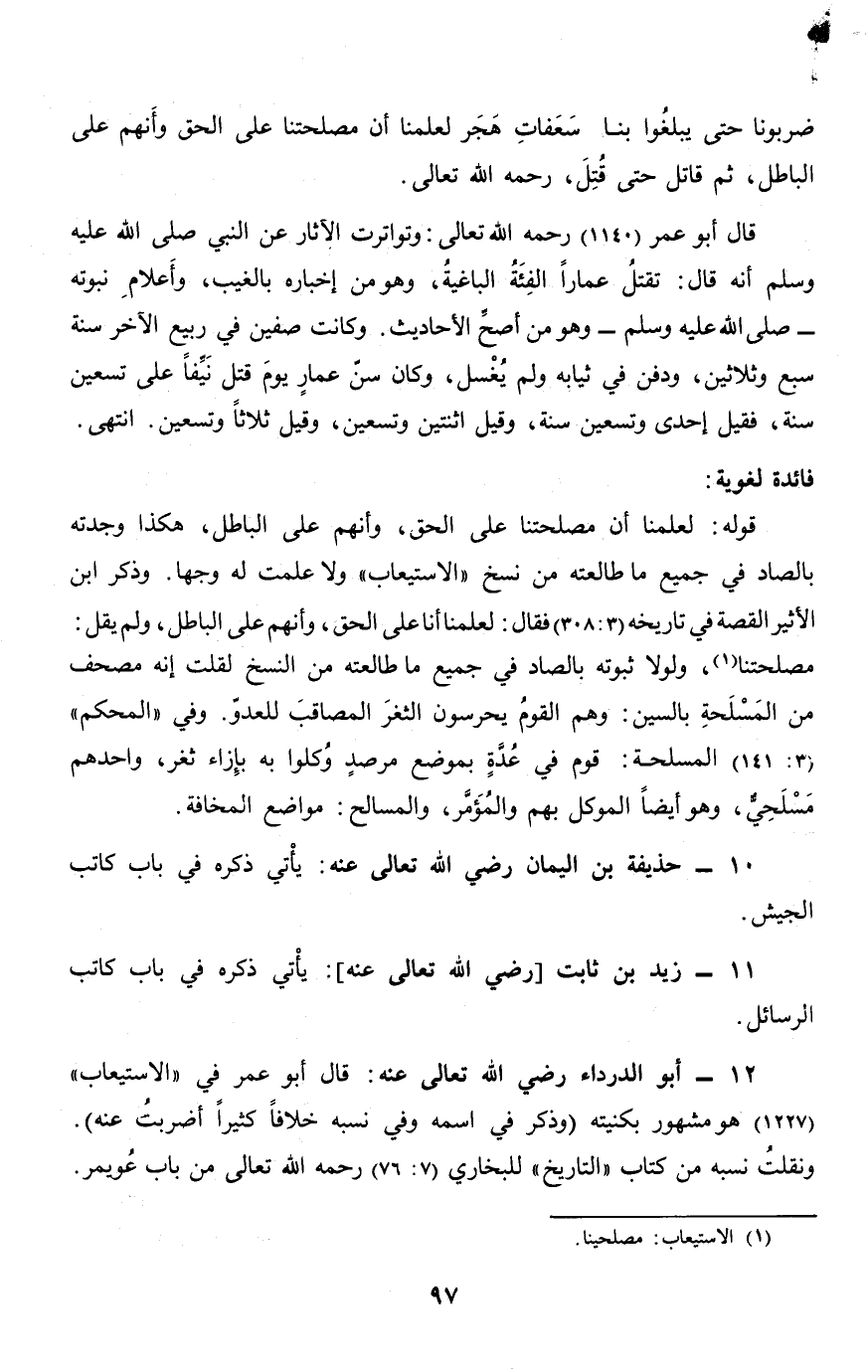 قوله: لعلمنا أن مصلحتنا على الحق، وأنهم على الباطل، هكذا وجدته بالصاد في جميع ما طالعته من نسخ «الاستيعاب» ولا علمت له وجها. وذكر ابن الأثير القصة في تاريخه (3: 308) فقال: لعلمنا أنا على الحق، وأنهم على الباطل، ولم يقل: