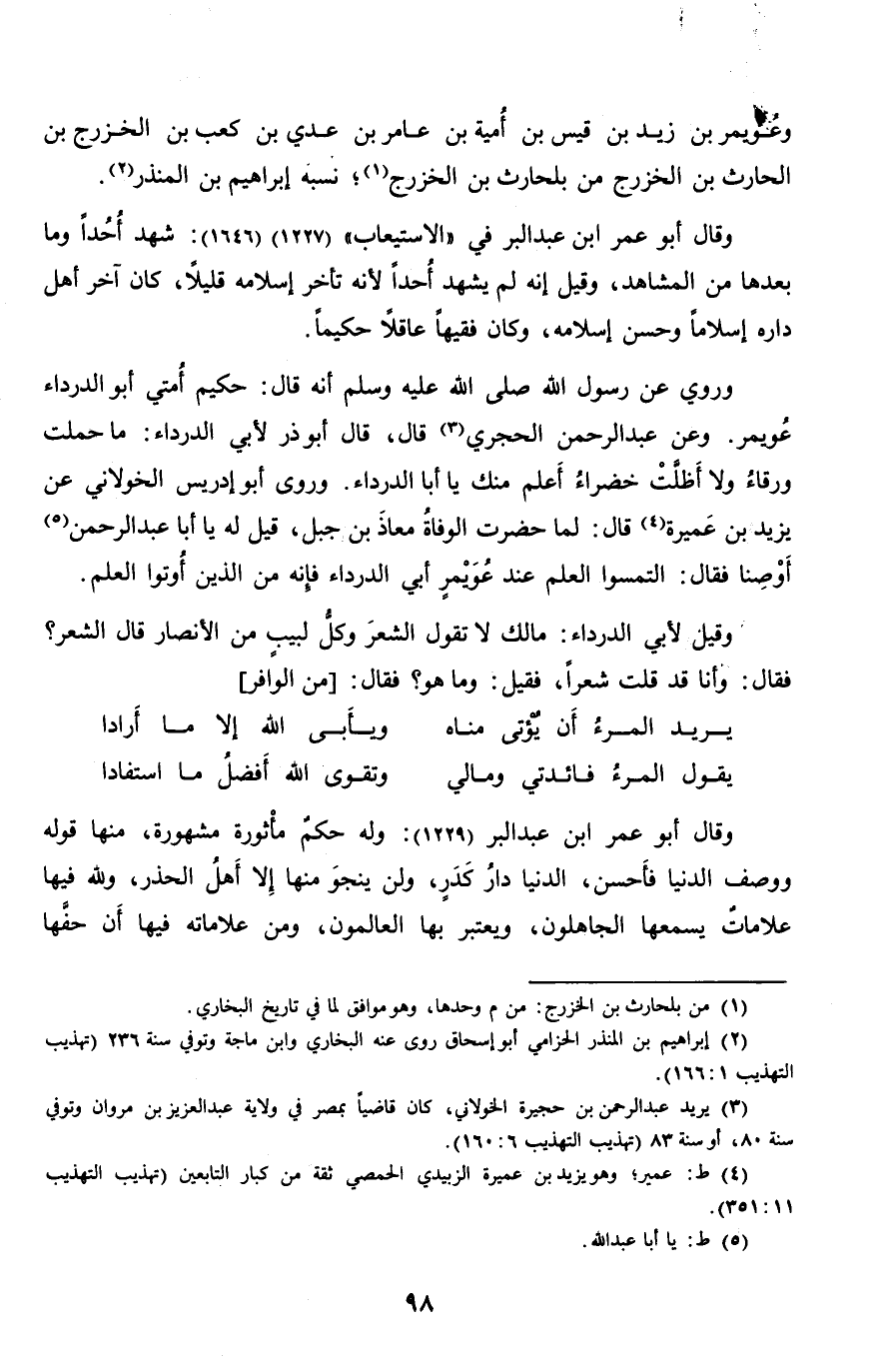 وعويمر بن زيد بن قيس بن أمية بن عامر بن عدي بن كعب بن الخزرج بن الحارث بن الخزرج من بلحارث بن الخزرج «1» ؛ نسبه إبراهيم بن المنذر «2» .