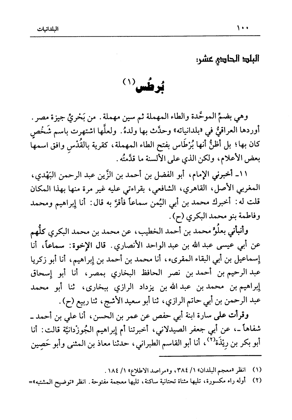11 - أَخْبَرَنِي الإِمَامُ أَبُو الْفَضْلِ بْنُ أَحْمَدَ بْنِ الزَّيْن عَبْدُ الرَّحْمَنِ الْبهدِيُّ الْمَغْرِبِيُّ الأَصْلُ الْقَاهِرِيُّ الشَّافِعِيُّ بِقَرَاءَتِي عَلَيْهِ غَيْرَ مَرَّةٍ مِنْهَا بِهَذَا الْمَكَانِ قُلْتُ لَهُ أَخْبَرَكَ مُحَمَّدُ بْنُ أَبِي الْيَمَنِ سَمَاعًا فَأَقَرَّ بِهِ قَالَ أَنا إِبْرَاهِيمُ وَمُحَمَّدٌ وَفَاطِمَةُ بَنُو مُحَمَّدٍ الْبَكْرِيُّ (ح)