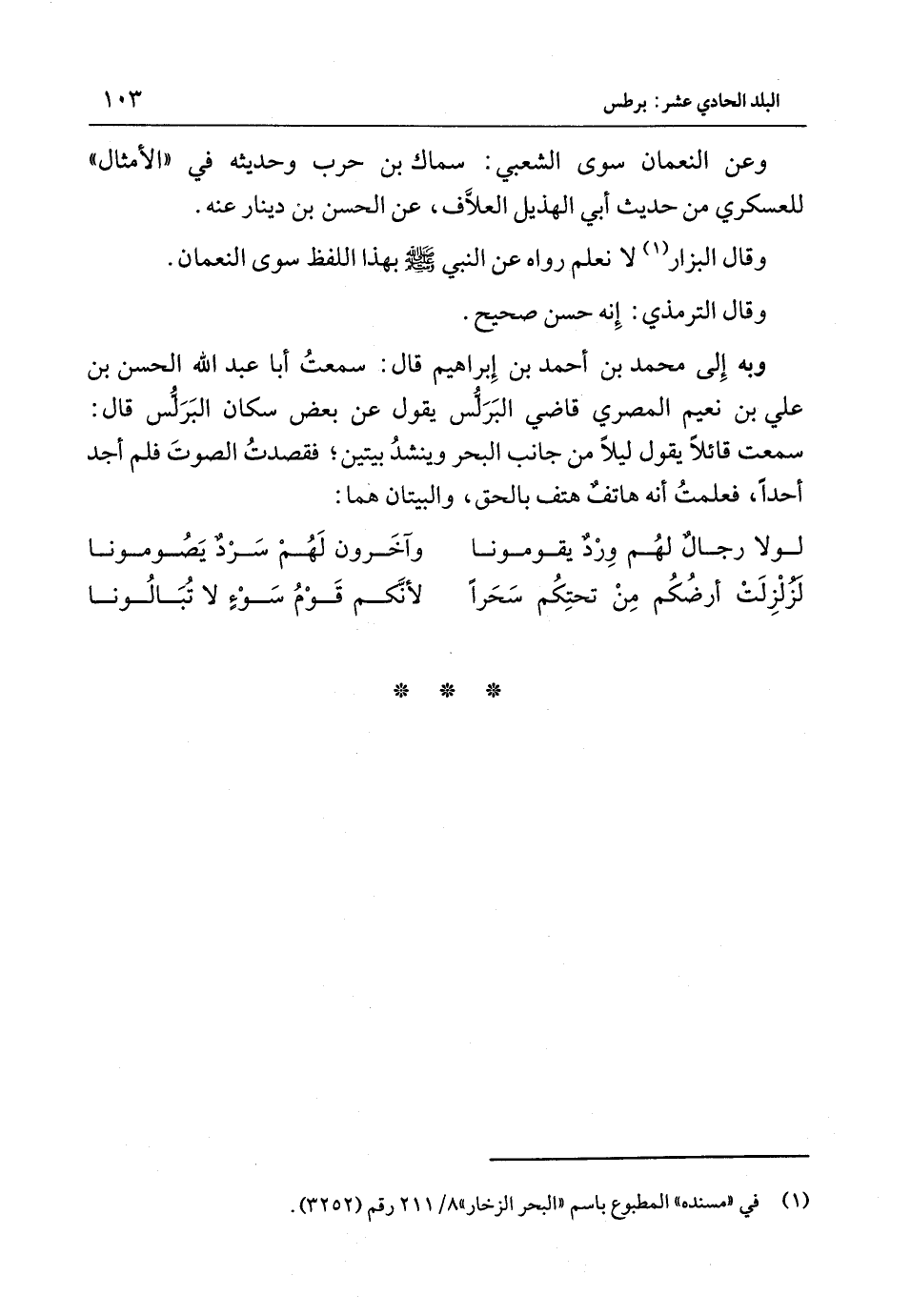 وَعَن النُّعْمَان سوى الشَّعْبِي سماك بْن حَرْب وحَدِيثه فِي الْأَمْثَال للعسكري من حَدِيث أَبِي الْهُذيْل العلاف عَنِ الْحَسَن بْن دِينَار عَنْهُ وَقَالَ الْبَزَّار لَا نعلم رَوَاهُ عَنِ النَّبِي {صَلَّى اللَّهُ عَلَيْهِ وَسَلَّمَ} بِهَذَا اللَّفْظ سوى النُّعْمَان وَقَالَ التِّرْمِذِي إِنَّه حسن صَحِيح وَبِهِ إِلَى مُحَمَّد بْن أَحْمَد بْن إِبْرَاهِيمَ قَالَ سَمِعت أَبَا عَبْد اللَّهِ الْحَسَن بْن عَلِي بْن نعيم الْمِصْرِي قَاضِي البرلس يَقُول عَنْ بَعْض سكان البرلس قَالَ سَمِعت قَائِلا يَقُول لَيْلًا من جَانب الْبَحْر وينشد بَيْتَيْنِ فقصدت الصَّوْت فَلم أجد أحدا فَعلمت أَنه هَاتِف هتف بِالْحَقِّ والبيتان هما لَوْلَا رجال لَهُم ورد يقومونا