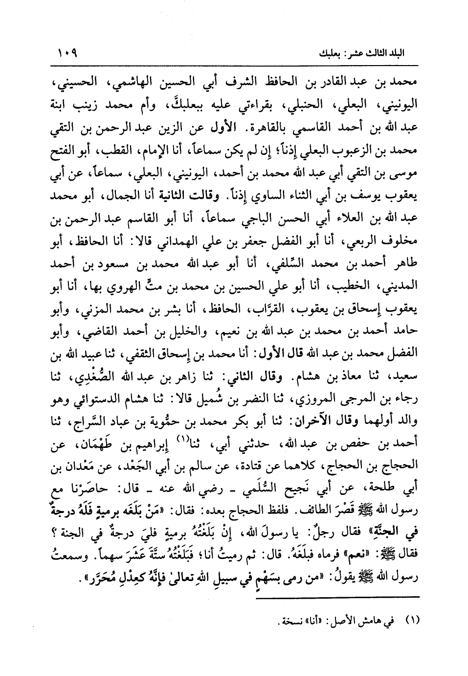 مُحَمَّدِ بْنِ عَبْدِ الْقَادِرِ بْنِ الْحَافِظِ الشَّرَفُ أَبِي الْحُسَيْنِ الْهَاشِمِيُّ الْحُسَيْنِيُّ الْيُونيِنِيُّ الْبَعْلِيُّ الْحَنْبَلِيُّ بِقَرَاءَتِي عَلَيْهِ بِبَعْلَبَكَّ وَأُمُّ مُحَمَّدٍ زَيْنَبُ ابْنَةُ عَبْدِ اللَّهِ بْنِ أَحْمَدَ الْقَاسِمِيُّ بِالْقَاهِرَةِ الأَوَّلُ عَنِ الزَّيْنِ عَبْدِ الرَّحْمَنِ بْنِ التَّقِيِّ مُحَمَّدِ بْنِ الزَّعْبُوبِ الْبَعْلِيِّ إِذْنًا إِنِّ لَمْ يَكُنْ سَمَاعًا أَنا الإِمَامُ الْقُطْبُ أَبُو الْفَتْحِ مُوسَى بْنُ التَّقِيِّ أَبِي عَبْدِ اللَّهِ مُحَمَّدُ بْنُ أَحْمَدَ الْيُونيِنِيُّ الْبَعْلِيُّ سَمَاعًا عَنْ أَبِي يَعْقُوبَ يُوسُفَ بْنَ أَبِي الثَّنَاءِ السَّاوِيِّ إِذْنًا وَقَالَتِ الثَّانِيَةُ أَنا الْجَّمَّالُ أَبُو مُحَمَّدٍ عَبْدُ اللَّهِ بْنُ الْعَلاءِ أَبِي الْحَسَنِ الْبَاجِيُّ سَمَاعًا أَنا أَبُو الْقَاسِمِ عَبْدُ الرَّحْمَنِ بْنُ مَخْلُوفٍ الرِّبْعِيُّ أَنا أَبُو الْفَضْلِ جَعْفَرُ بن عَليّ الهمذاني قَالا أَنا الْحَافِظُ أَبُو طَاهِرٍ أَحْمَدُ بْنُ مُحَمَّدٍ السَّلَفِيُّ أَنا أَبُو عَبْدِ اللَّهِ مُحَمَّدُ بْنُ مَسْعُودِ بْنِ أَحْمَدَ الْمَدِينِيُّ الْخَطِيبُ أَنا أَبُو عَلِيٍّ الْحُسَيْنُ بْنُ مُحَمَّدِ بْنِ مت الْهَرَوِيُّ بِهَا أَنا أَبُو يَعْقُوبَ إِسْحَاقُ بْنُ يَعْقُوبَ القَّرَّابُ الْحَافِظُ أَنا بِشْرُ بن مُحَمَّد الْمُزنِيّ وَأَبُو حَامِدٍ أَحْمَدُ بْنُ مُحَمَّدِ بْنِ عَبْدِ اللَّهِ بْنِ نُعَيْمٍ وَالْخَلِيلُ بْنُ أَحْمَدَ الْقَاضِي وَأَبُو الْفَضْلِ مُحَمَّدُ بْنُ عَبْدِ اللَّهِ قَالَ الأَوَّلُ أَنا مُحَمَّدُ بْنُ إِسْحَاقَ الثَّقَفِيُّ ثَنَا عُبَيْدُ اللَّهِ بْنُ سَعِيدٍ ثَنَا مُعَاذُ بْنُ هِشَامٍ وَقَالَ الثَّانِي ثَنَا زَاهِرُ بْنُ عَبْدِ اللَّهِ الصَّغْدِيُّ ثَنَا رَجَاءُ بْنُ الْمُرَجَّى الْمَرْوَزِيُّ ثَنَا النَّضْرُ بن شُمَيْل قَالَا ثَنَا هِشَام الدستوَائي وَهُوَ وَالِد أَولهمَا وَقَالَ الآخَرَانِ ثَنَا أَبُو بَكْرٍ مُحَمَّدُ بْنُ حَمَّوَيْهِ بْنِ عَبَّادٍ السَّرَّاجُ ثَنَا أَحْمَدُ بْنُ حَفْصِ بْنِ عَبْدِ اللَّهِ حَدَّثَنِي أَبِي ثَنَا إِبْرَاهِيمُ بْنُ طَهْمَانَ عَنْ الْحَجَّاجِ بْنِ الْحَجَّاجِ كِلاهُمَا عَنْ قَتَادَةَ عَنْ سَالِمِ بْنِ أَبِي الْجَعْدِ عَنْ مَعْدَانَ بْنِ أَبِي طَلْحَةَ عَنْ أَبِي نَجِيحٍ السَّلَمِيِّ - رَضِي الله عَنهُ - قَالَ حَاصَرْنَا مَعَ رَسُولِ اللَّهِ {صَلَّى اللَّهُ عَلَيْهِ وَسَلَّمَ} قَصْرَ الطَّائِفِ فَلَفَظَ الْحَجَّاجُ بَعْدَهُ فَقَالَ مَنْ بَلَغَهُ بِرَمْيَةٍ فَلَهُ دَرَجَةٌ فِي الْجَنَّةِ فَقَالَ رَجُلٌ يَا رَسُولَ اللَّهِ إِنْ بَلَغْتُهُ بَرَمْيَةٍ فِلِيِ دَرَجَةٌ فِي الْجَنَّةِ فَقَالَ {صَلَّى اللَّهُ عَلَيْهِ وَسَلَّمَ} نَعَمْ فَرَمَاهُ فَبَلَغَهُ قَالَ ثُمَّ رَمَيْتُ أَنَا فَبَلَّغْتُهُ سِتَّةَ عَشَرَ سَهْمًا وَسَمِعْتُ رَسُولَ اللَّهَ {صَلَّى اللَّهُ عَلَيْهِ وَسَلَّمَ} يَقُولُ مَنْ رَمَى بِسَهْمٍ فِي سَبِيلِ اللَّهِ تَعَالَى فَإِنَّهُ كَعَدْلِ مُحَرِّرٍ