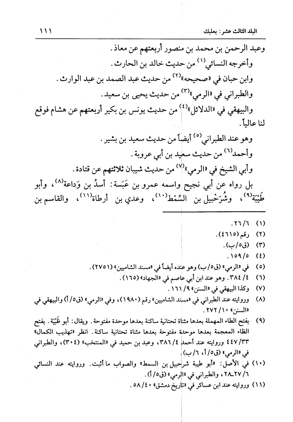 وعَبْد الرَّحْمَنِ بْن مُحَمَّد بْن مَنْصُور أربعتهم عَنْ معَاذ وَأخرجه النَّسَائِيّ من حَدِيث خَالِد بْن الْحَارِث وَابْن حبَان فِي صَحِيحه من حَدِيث عَبْد الصَّمد بْن عَبْد الْوَارِث وَالطَّبَرَانِيّ فِي الرَّمْي من حَدِيث يَحْيَى بْن سَعِيد وَالْبَيْهَقِيّ فِي الدَّلَائِل من حَدِيث يُونُس بْن بكير أربعتهم عَنْ هِشَام فَوَقع لنا عَالِيًا وَهُوَ عِنْدَ الطَّبَرَانِي أَيْضا من حَدِيث سعيد بن بشير وَأَحْمَد من حَدِيث سَعِيد بْن أَبِي عرُوبَة وَأبي الشَّيْخ فِي الرَّمْي من حَدِيث شَيبَان ثَلَاثَتهمْ عَنْ قَتَادَة بَل رَوَاهُ عَنْ أَبِي نجيح واسْمه عَمْرو بْن عبسة أَسد بْن ودَاعَة وَأَبُو طيبَة وشرحبيل بْن السمط وعدي بْن أَرْطَاة وَالقَاسِم بْن