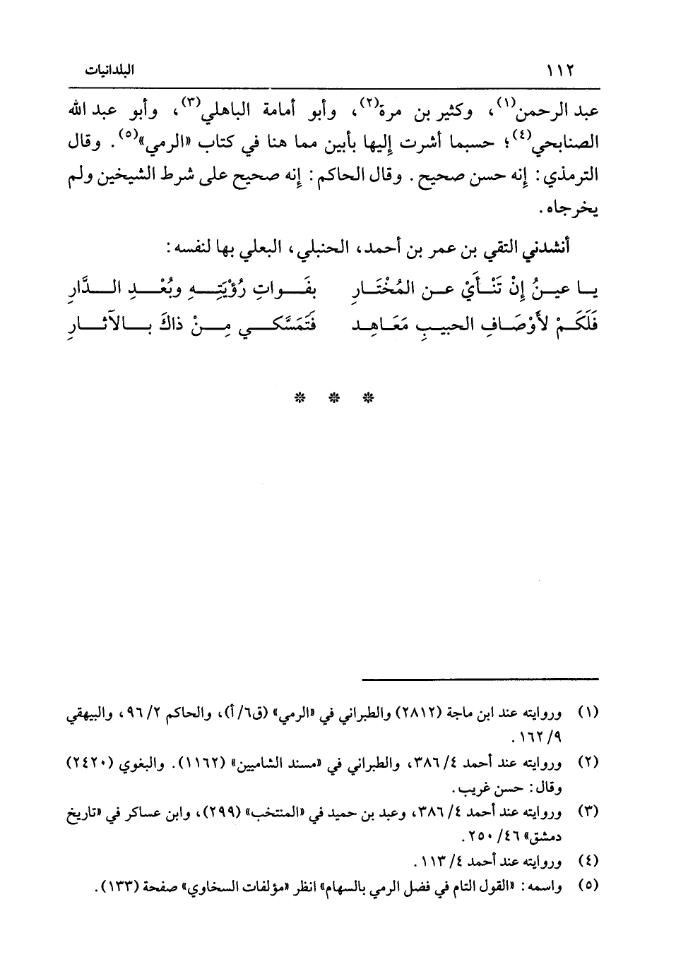 عَبْد الرَّحْمَنِ وَكثير بْن مرّة وَأَبُو أُمَامَة الْبَاهِلِي وَأَبُو عَبْد اللَّهِ الصنَابحِي حَسْبَمَا أَشرت إِلَيْهَا بأبين مِمَّا هُنَا فِي كتاب الرَّمْي وَقَالَ التِّرْمِذِي إِنَّه حسن صَحِيح وَقَالَ الْحَاكِم إِنَّه صَحِيح عَلَى شَرط الشَّيْخَيْنِ وَلَمْ يخرجَاهُ أَنْشدني التَّقِي بْن عُمَر بْن أَحْمَد الْحَنْبَلِيّ البعلي بِهَا لنَفسِهِ يَا عين إِن تنأي عَنِ الْمُخْتَار