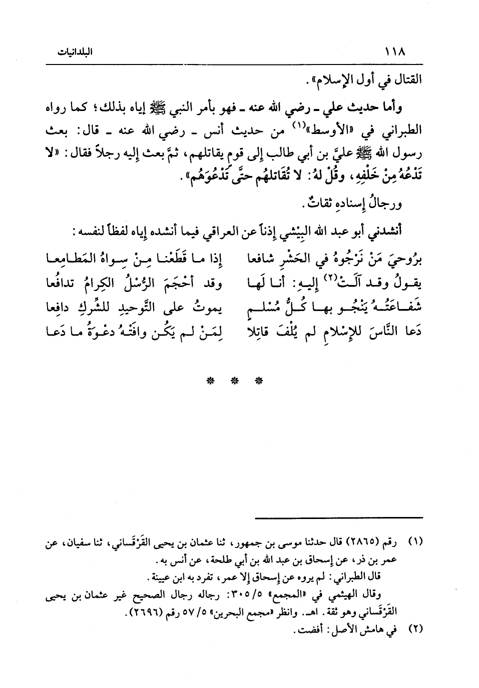 الْقِتَال فِي أول الإِسْلام وَأَمَّا حَدِيث عَلِي - رَضِيَ اللَّهُ عَنْهُ - فَهُوَ بِأَمْر النَّبِي {صَلَّى اللَّهُ عَلَيْهِ وَسَلَّمَ} إِيَّاه بِذَلِكَ كَمَا رَوَاهُ الطَّبَرَانِي فِي الْأَوْسَط من حَدِيث أَنَس - رَضِيَ اللَّهُ عَنْهُ - قَالَ بعث رَسُول اللَّهِ {صَلَّى اللَّهُ عَلَيْهِ وَسَلَّمَ} عَلِي بْن أَبِي طَالب إِلَى قوم يقاتلهم ثُمَّ بعث إِلَيْهِ رجلا فَقَالَ لَا تَدعه من خَلفه وَقل لَهُ لَا تقَاتلهمْ حَتَّى تدعوهم وَرِجَال إِسْنَاده ثِقَات أَنْشدني أَبُو عَبْد اللَّهِ البيشي إِذْنًا عَنِ الْعِرَاقِيّ فِيمَا أنْشدهُ إِيَّاه لفظا لنَفسِهِ بروحي من نرجوه فِي الْحَشْر شافعا