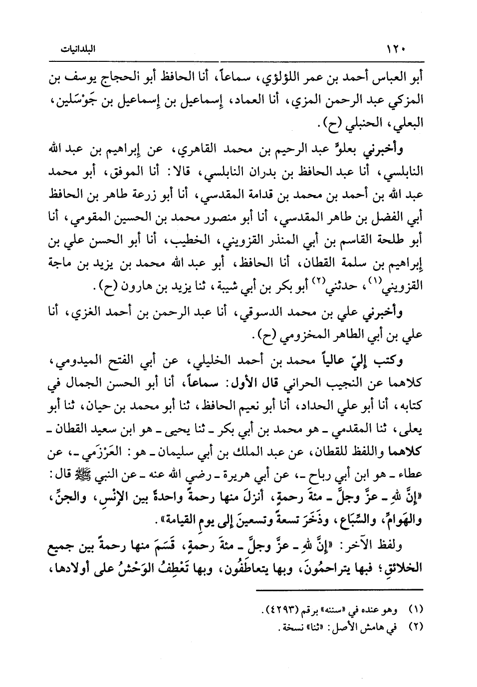 وَكَتَبَ إِلَيَّ عَالِيًا مُحَمَّدُ بْنُ أَحْمَدَ الْخَلِيلِيُّ عَنْ أَبِي الْفَتْحِ الْمَيْدُومِيِّ كِلاهُمَا عَنْ النَّجِيبِ الْحَرَّانِيُّ قَالَ الأَوَّلُ سَمَاعًا أَنا أَبُو الْحَسَنِ الْجَمَّالُ فِي كِتَابِهِ أَنا أَبُو عَلَيٍّ الْحَدَّادُ أَنا أَبُو نُعَيْمٍ الْحَافِظُ ثَنَا أَبُو مُحَمَّدِ بْنُ حَيَّانَ ثَنَا أَبُو يَعْلَى ثَنَا الْمقدمِي - هومحمد بْنُ أَبِي بَكْرٍ - ثَنَا يَحْيَى - هُوَ ابْنُ سَعِيدٍ الْقَطَّانُ - كِلاهُمَا وَاللَّفْظُ لِلْقَطَّانِ عَنْ عَبْدِ الْمَلِكِ بْنِ أَبِي سُلَيْمَانَ - هُوَ الْعَرْزَمِيُّ - عَنْ عَطَاءٍ - هُوَ ابْنُ أَبِي رَبَاحٍ - عَنْ أَبِي هُرَيْرَةَ - رَضِيَ اللَّهُ عَنْهُ - عَنِ النَّبِيِّ {صَلَّى اللَّهُ عَلَيْهِ وَسَلَّمَ} قَالَ إِنَّ لله - عز وَجل - مئة رَحْمَةٍ أَنْزَلَ مِنْهَا رَحْمَةً وَاحِدَةً بَيْنَ الإِنْسِ وَالْجِنِّ وَالْهَوَامِ وَالسِّبَاعِ وَذَخَرَ تِسْعَةً وَتِسْعِينَ إِلَى يَوْمِ الْقِيَامَةِ وَلَفْظُ الآخَرِ إِنَّ لِلَّهِ - عز وَجل - مئة رَحْمَةٍ قَسَمَ مِنْهَا رَحْمَةً بَيْنَ جَمِيعِ الْخَلائِقِ فَبِهَا يَتَرَاحَمُونَ وَبِهَا يَتَعَاطَفُونَ وَبِهَا تَعْطِفُ الْوَحْشُ عَلَى أَوْلادِهَا