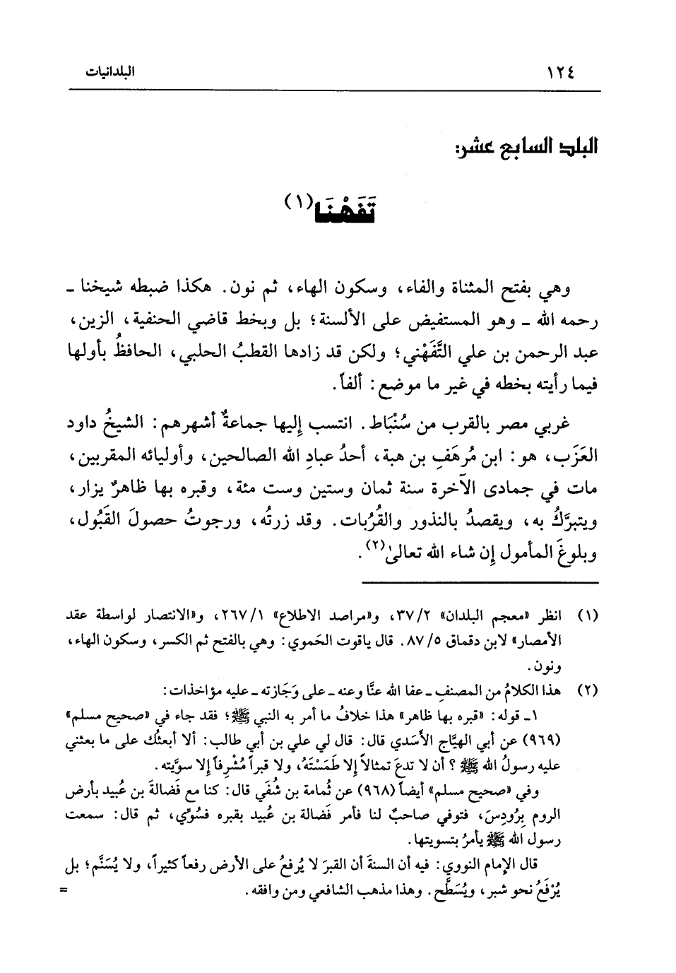 وَهِيَ بِفَتْح الْمُثَنَّاة وَالْفَاء وَسُكُون الْهَاء ثُمَّ نون هَكَذَا ضَبطه شَيخنَا - رَحمَه الله - هُوَ المستفيض عَلَى الْأَلْسِنَة بَل وبخط قَاضِي الْحَنَفِيَّة الزَّيْن عَبْد الرَّحْمَنِ بْن عَلِي التفهني وَلَكِن قَدْ زَادهَا القطب الْحلَبِي الْحَافِظ بأولها فِيمَا رَأَيْته بِخَطِّهِ فِي غَيْر مَا مَوضِع ألفا غربي مصر بِالْقربِ من سنباط انتسب إِلَيْهَا جَمَاعَة أشهرهم الشَّيْخ دَاوُد العزب هُوَ ابْن مرهف بْن هبة أحد عباد اللَّه الصَّالِحين وأوليائه المقربين مَات فِي جمادي الْآخِرَة سنة ثَمَان وَسِتِّينَ وست مئة وقبره بِهَا ظَاهر يزار ويتبرك بِهِ ويقصد بالنذور والقربات وَقَدْ زرته ورجوت حُصُول الْقبُول وبلوغ المأمول إِن شَاءَ اللَّه تَعَالَى