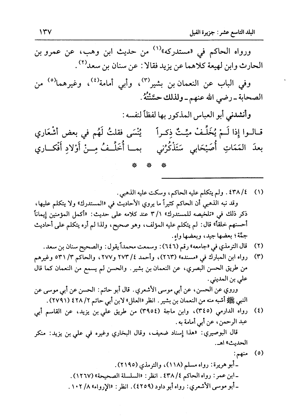 وَرَوَاهُ الْحَاكِم فِي مُسْتَدْركه من حَدِيث ابْن وهب عَنْ عَمْرو بْن الْحَارِث وَابْن لَهِيعَة كِلَاهُمَا عَنْ يَزِيد فَقَالَا عَنْ سِنَان بْن سَعْد وَفِي الْبَاب عَنِ النُّعْمَان بْن بشير وَأبي أُمَامَة وَغَيرهمَا من الصَّحَابَة - رَضِيَ اللَّهُ عَنْهُم - وَلذَلِك حسنته وأنشدني أَبُو الْعَبَّاس الْمَذْكُور بِهَا لفظا لنَفسِهِ قَالُوا إِذَا لَمْ يخلف ميت ذكرا
