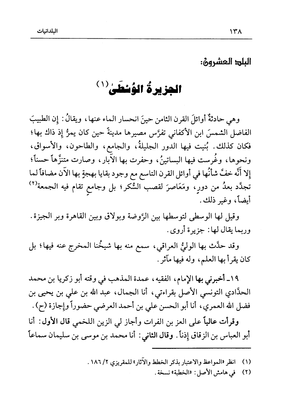 وَهِيَ حَادِثَة أَوَائِل الْقرن الثَّامِن حِينَ انحسار المَاء عَنْهَا وَيُقَال إِن الطَّبِيب الْفَاضِل الشَّمْس ابْن الْأَكْفَانِيِّ تفرس مصيرها مَدِينَة حِينَ كَانَ يمر إِذْ ذَاك بِهَا فَكَانَ كَذَلِك بنيت فِيهَا الدّور الجليلة وَالْجَامِع والطاحون والأسواق وَنَحْوهَا وغرست فِيهَا الْبَسَاتِين وحفرت بِهَا الْآبَار وَصَارَت متنزها حسنا إِلَّا أَنه خف شَأْنهَا فِي أَوَائِل الْقرن التَّاسِع مَعَ وجود بقايا بهجة بِهَا الْآن مُضَافا لما تجدّد بَعْد من دور ومعاصر لقصب السكر بَل وجامع تُقَام فِيهِ الْجُمُعَة أَيْضا وَغير ذَلِكَ وَقيل لَهَا الْوُسْطَى لتوسطها بَيْنَ الرَّوْضَة وبولاق وَبَين الْقَاهِرَة وبر الجيزة وَرُبمَا يُقَال لَهَا جَزِيرَة أروى وَقَدْ حدث بِهَا الْوَلِيّ الْعِرَاقِيّ سمع مِنْهُ بِهَا شَيخنَا الْمخْرج عَنْهُ فِيهَا بَل كَانَ يقْرَأ بِهَا الْعلم وَلَهُ فِيهَا مآثر