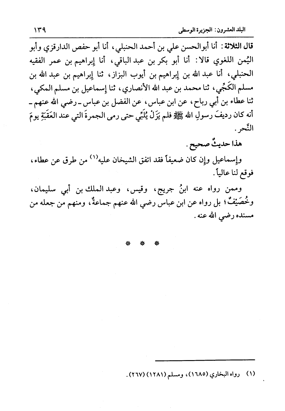 قَالَ الثَّلاثَةُ أَنا أَبُو الْحَسَنِ عَلِيُّ بْنُ أَحْمَدَ الْحَنْبَلِيُّ أَنا أَبُو حَفْصٍ الدَّارَقَزِّيُّ وَأَبُو الْيَمَنِ اللُّغَوِيُّ قَالا أَنا أَبُو بَكْرِ بْنُ عَبْدِ الْبَاقِي أَنا إِبْرَاهِيمُ بْنُ عُمَرَ الْفَقِيهُ الْحَنْبَلِيُّ أَنا عَبْدُ اللَّهِ بْنُ إِبْرَاهِيمَ بْنِ أَيُّوبَ الْبَزَّازُ ثَنَا إِبْرَاهِيمُ بْنُ عَبْدِ اللَّهِ بْنِ مُسْلِمٍ الْكَجِّيُّ ثَنَا مُحَمَّدُ بْنُ عَبْدِ اللَّهِ الأَنْصَارِيُّ ثَنَا إِسْمَاعِيلُ بْنُ مُسْلِمٍ الْمَكِّيُّ ثَنَا عَطَاءُ بْنُ أَبِي رَبَاحٍ عَنِ ابْن عَبَّاسٍ عَنِ الْفَضْلِ بْنِ عَبَّاسٍ - رَضِيَ اللَّهُ عَنْهُم - أَنَّهُ كَانَ ردِيفَ رَسُولِ اللَّهَ {صَلَّى اللَّهُ عَلَيْهِ وَسَلَّمَ} فَلَمْ يَزَلْ يُلَبِّي حَتَّى رَمَى الْجَمْرَةَ الَّتِي عِنْدَ الْعَقَبَةِ يَوْمَ النَّحْرِ هَذَا حَدِيث صَحِيحٌ وَإِسْمَاعِيلُ وَإِنْ كَانَ ضَعِيفًا فَقَدِ اتَّفَقَ الشَّيْخَانِ عَلَيْهِ مِنْ طُرُقٍ عَنْ عَطَاءٍ فَوَقَعَ لَنَا عَالِيًا وَمِمَّنْ رَوَاهُ عَنْهُ ابْنُ جُرَيْجٍ وَقَيْسٌ وَعَبْدُ الْمَلِكِ بْنُ أَبِي سُلَيْمَانَ وَخَصِيفٌ بَلْ رَوَاهُ عَنِ ابْنِ عَبَّاسٍ رَضِيَ اللَّهُ عَنْهُم جَمَاعَةٌ وَمِنْهُمْ مَنْ جَعَلَهُ مِنْ مُسْنَدِهِ رَضِيَ اللَّهُ عَنْهُ