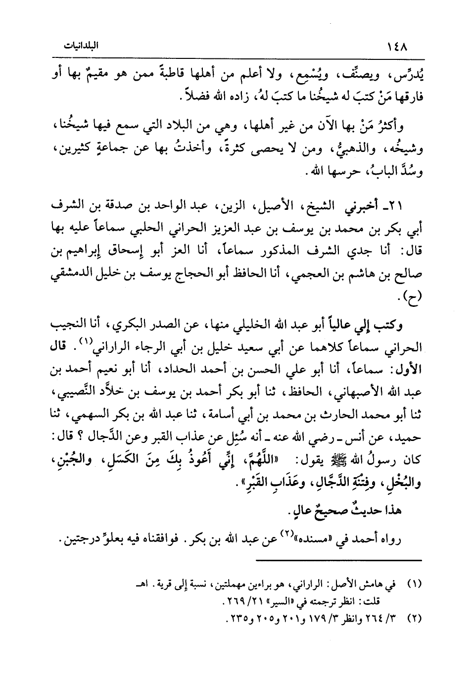 وَكَتَبَ إِلَيَّ عَالِيًا أَبُو عَبْدِ اللَّهِ الْخَلِيلِيُّ مِنْهَا عَنْ الصَّدْرِ الْبَكْرِيِّ أَنا النَّجِيبُ الْحَرَّانِيُّ سَمَاعًا كِلاهُمَا عَنْ أَبِي سَعِيدٍ خَلِيلِ بْنِ أَبِي الرَّجَاءِ الرَّارَانِيِّ قَالَ الأَوَّلُ سَمَاعًا أَنا أَبُو عَلِيٍّ الْحَسَنُ بْنُ أَحْمَدَ الْحَدَّادُ أَنا أَبُو نُعَيْمٍ أَحْمَدُ بْنُ عَبْدِ اللَّهِ الأَصْبَهَانِيُّ الْحَافِظُ ثَنَا أَبُو بَكْرٍ أَحْمَدُ بْنُ يُوسُفَ بْنِ خَلادٍ النُّصَيْبِيُّ ثَنَا أَبُو مُحَمَّدٍ الْحَارِثُ بْنُ مُحَمَّدِ بْنِ أَبِي أُسَامَةَ ثَنَا عَبْدُ اللَّهِ بْنُ بَكْرٍ السَّهْمِيُّ ثَنَا حُمَيْدٌ عَنْ أَنَس - رَضِيَ اللَّهُ عَنْهُ - أَنَّهُ سُئِلَ عَنْ عَذَابِ الْقَبْرِ وَعَنِ الدَّجَّالِ قَالَ كَانَ رَسُولُ اللَّهَ {صَلَّى اللَّهُ عَلَيْهِ وَسَلَّمَ} يَقُولُ اللَّهُمَّ إِنِّي أَعُوذُ بِكَ مِنَ الْكَسَلِ وَالْجُبْنِ وَالْبُخْلِ وَفِتْنَةِ الدَّجَّالِ وَعَذَابِ الْقَبْرِ هَذَا حَدِيثٌ صَحِيحٌ عَالٍ رَوَاهُ أَحْمَدُ فِي مُسْنَدِهِ عَنْ عَبْدِ اللَّهِ بْنِ بَكْرٍ فَوَافَقْنَاهُ فِيهِ بِعُلُوٍّ دَرَجَتَيْنِ