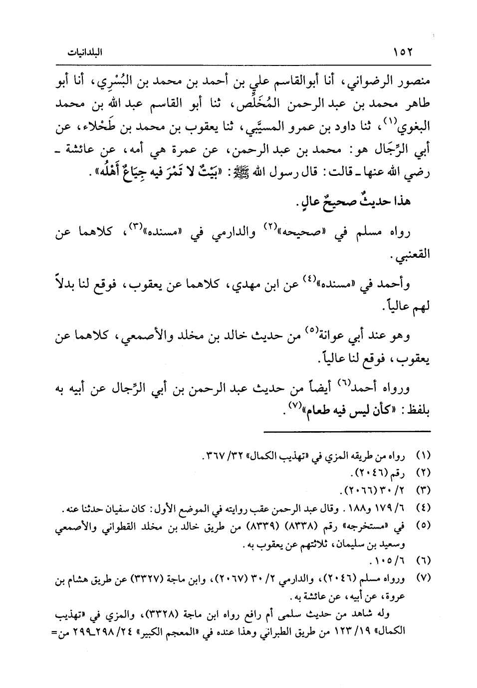 مَنْصُورٍ الرَّضْوَانِيُّ أَنا أَبُو الْقَاسِمِ عَلِيُّ بْنُ أَحْمَدَ بْنِ مُحَمَّدِ بْنِ الْبُسْرِيِّ أَنا أَبُو طَاهِرٍ مُحَمَّدُ بْنُ عَبْدِ الرَّحْمَنِ الْمُخَلِّصُ ثَنَا أَبُو الْقَاسِمِ عَبْدُ اللَّهِ بْنُ مُحَمَّدٍ الْبَغَوِيُّ ثَنَا دَاوُدُ بْنُ عَمْرٍو الْمسيبي ثَنَا يَعْقُوبُ بْنُ مُحَمَّدِ بْنِ طَحْلاءَ عَنْ أَبِي الرِّجَالِ هُوَ مُحَمَّدُ بْنُ عَبْدِ الرَّحْمَنِ عَنْ عَمْرَةَ هِيَ أُمَّهُ عَنْ عَائِشَةَ - رَضِيَ اللَّهُ عَنْهَا - قَالَتْ قَالَ رَسُولُ اللَّهُ {صَلَّى اللَّهُ عَلَيْهِ وَسَلَّمَ} بَيْتٌ لَا تَمْرَ فِيهِ جِيَاعٌ أَهْلُهُ هَذَا حَدِيثٌ صَحِيحٌ عَالٍ رَوَاهُ مُسْلِمٌ فِي صَحِيحِهِ وَالدَّارِمِيُّ فِي مُسْنَدِهِ كِلاهُمَا عَنِ الْقَعْنَبِيِّ وَأَحْمَدُ فِي مُسْنَدِهِ عَنِ ابْنِ مَهْدِيٍّ كِلاهُمَا عَنْ يَعْقُوبَ فَوَقَعَ لَنَا بَدَلا لَهُم عَالِيًا وَهُوَ عِنْدَ أَبِي عَوَانَةَ مِنْ حَدِيثِ خَالِدِ بْنِ مَخْلَدٍ وَالأَصْمَعِيِّ كِلاهُمَا عَنْ يَعْقُوبَ فَوَقَعَ لَنَا عَالِيًا وَرَوَاهُ أَحْمَد أَيْضا من حَدِيث عَبْد الرَّحْمَن بِي أَبِي الرِّجَال عَنْ أَبِيهِ بِهِ بِلَفْظ كَأَن لَيْسَ فِيهِ طَعَام
