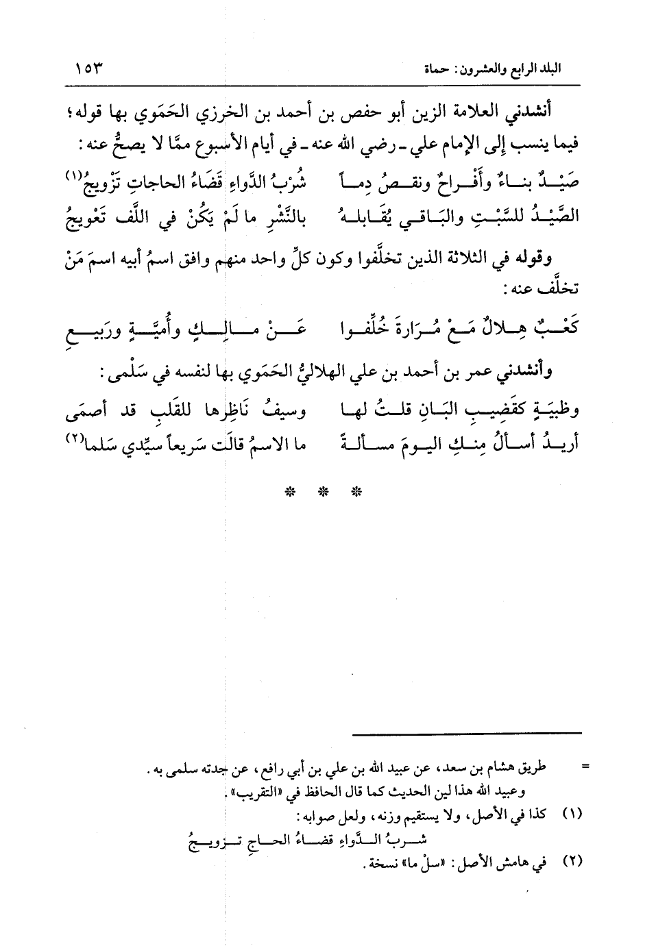 أَنْشدني الْعَلامَة الزَّيْن أَبُو حَفْص بْن أَحْمَد بْن الخرزي الْحَمَوِيّ بِهَا قَوْله فِيمَا ينْسب إِلَى الإِمَام عَلِي - رَضِيَ اللَّهُ عَنْهُ - فِي أَيَّام الْأُسْبُوع مِمَّا لايصح عَنْهُ صيد بِنَاء وأفراح وَنقص دَمًا