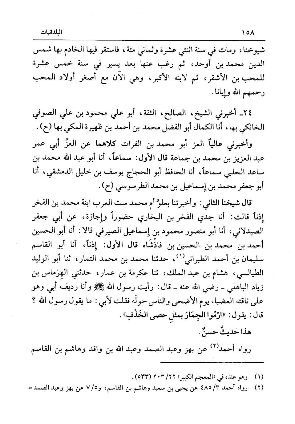 قَالَ شَيْخُنَا الثَّانِي وَأَخْبَرَتْنَا بِعُلُوٍّ أُمُّ مُحَمَّدٍ سِتُّ الْعَرَبِ ابْنَةَ مُحَمَّدِ بْنِ الْفَخْرِ إِذْنًا قَالَتْ أَنا جدي الْفَخر بْن الْبُخَارِي حُضُورًا وَإِجَازَةً عَنْ أَبِي جَعْفَرٍ الصَّيْدَلانِيِّ أَنا أَبُو مَنْصُورٍ مَحْمُودُ بْنُ إِسْمَاعِيلَ الصَّيْرَفِيُّ قَالا أَنا أَبُو الْحُسَيْنِ أَحْمَدُ بْنُ مُحَمَّدِ بْنِ الْحُسَيْنِ بْنِ فَاذَشَاهِ قَالَ الأَوَّلُ إِذْنًا أَنا أَبُو الْقَاسِمِ سُلَيْمَانُ بْنُ أَحْمَدَ الطَّبَرَانِيُّ حَدَّثَنَا مُحَمَّدُ بْنُ مُحَمَّدٍ التَّمَّارُ ثَنَا أَبُو الْوَلِيدُ الطَّيَالِسِيُّ هِشَامُ بْنُ عَبْدِ الْمَلِكِ ثَنَا عِكْرِمَةُ بْنُ عَمَّارٍ حَدَّثَنِي الْهِرْمَاسُ بْنُ زِيَادٍ الْبَاهِلِيُّ - رَضِيَ اللَّهُ عَنْهُ - قَالَ رَأَيْتُ رَسُولَ اللَّهَ {صَلَّى اللَّهُ عَلَيْهِ وَسَلَّمَ} وَأَنَا ردِيفُ أَبِي وَهُوَ عَلَى نَاقَتِهِ الْعَضْبَاءِ يَوْمَ الأَضْحَى وَالنَّاسُ حَوْلَهُ فَقُلْتُ لأَبِي مَا يَقُولُ رَسُولُ اللَّهِ قَالَ يَقُولُ ارْمُوا الْجِمَارَ بِمِثْلِ حَصَى الْخَذْفِ هَذَا حَدِيثٌ حَسَنٌ رَوَاهُ أَحْمَدُ عَنْ بَهْزٍ وَعَبْدِ الصَّمَدِ وَعَبْدِ اللَّهِ بْنِ وَاقِدٍ وَهَاشِمِ بْنِ الْقَاسِمِ