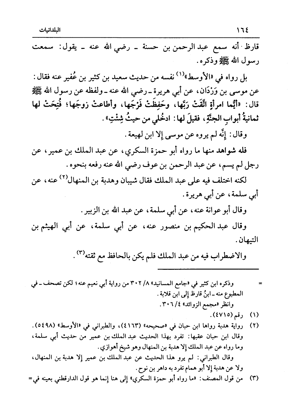 قارظ أَنه سمع عَبْد الرَّحْمَنِ بْن حَسَنَة - رَضِيَ اللَّهُ عَنْهُ - يَقُول سَمِعْتُ رَسُولَ اللَّهِ {صَلَّى اللَّهُ عَلَيْهِ وَسَلَّمَ} وَذكره بَل رَوَاهُ فِي الْأَوْسَط نَفْسه من حَدِيث سَعِيد بْن كثير بْن عفير عَنْهُ فَقَالَ عَنْ مُوسَى بْن وردان عَنْ أَبِي هُرَيْرَة - رَضِيَ اللَّهُ عَنْهُ - وَلَفظه عَنْ رَسُولَ اللَّهَ {صَلَّى اللَّهُ عَلَيْهِ وَسَلَّمَ} قَالَ أَيّمَا امْرَأَة اتقت رَبهَا وحفظت فرجهَا وأطاعت زَوجهَا فتحت لَهَا ثَمَانِيَة أَبْوَاب الْجَنَّة فَقيل لَهَا ادخلي من حَيْثُ شِئْت وَقَالَ إِنَّه لَمْ يروه عَنْ مُوسَى إِلَّا ابْن لَهِيعَة فَلهُ شَوَاهِد مِنْهَا مَا رَوَاهُ أَبُو حَمْزَة السكرِي عَنْ عَبْد الْملك بْن عُمَيْر عَنْ رجل لَمْ يسم عَنْ عَبْد الرَّحْمَنِ بْنِ عَوْفٍ رَضِيَ اللَّهُ عَنْهُ رَفعه بِنَحْوِهِ لكنه اخْتلف فِيهِ عَلَى عَبْد الْملك فَقَالَ شَيبَان وهدبة بْن الْمنْهَال عَنْهُ عَنْ أَبِي سَلمَة عَنْ أَبِي هُرَيْرَة وَقَالَ أَبُو عوَانَة عَنْهُ عَنْ أَبِي سَلمَة عَنْ عَبْد اللَّهِ بْن الزُّبَيْر وَقَالَ عَبْد الْحَكِيم بْن مَنْصُور عَنْهُ عَنْ أَبِي سَلمَة عَنْ أَبِي الْهَيْثَم بْن التيهَان وَالِاضْطِرَاب فِيهِ من عَبْد الْملك فَلم يكن بِالْحَافِظِ مَعَ ثقته