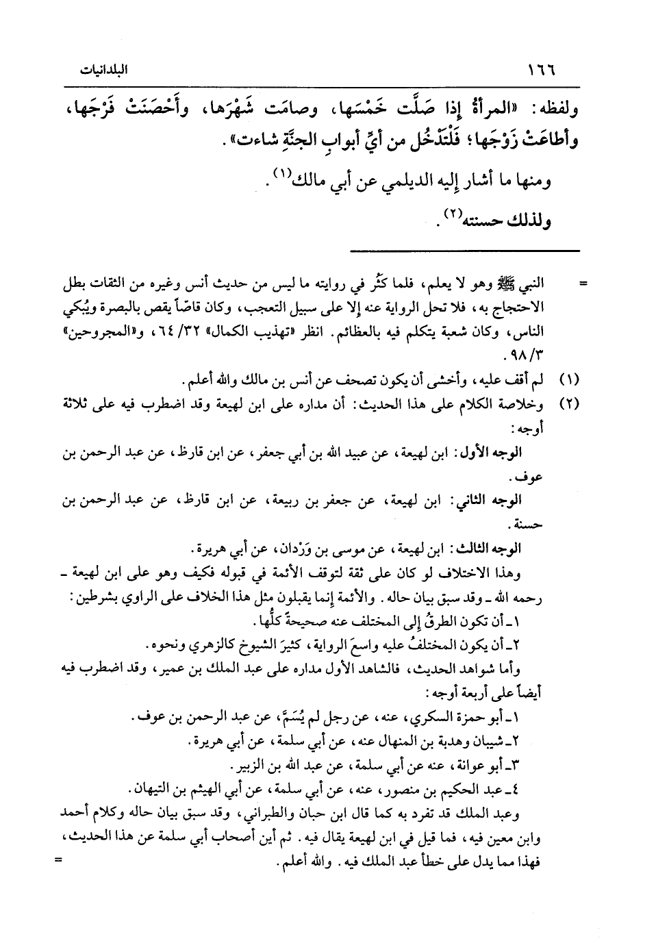 وَلَفظه الْمَرْأَة إِذَا صلت خمسها وصامت شهرها وأحصنت فرجهَا وأطاعت زَوجهَا فلتدخل من أَي أَبْوَاب الْجَنَّة شَاءَت وَمِنْهَا مَا أَشَارَ إِلَيْهِ الديلمي عَنْ أَبِي مَالِك وَلذَلِك حسنته
