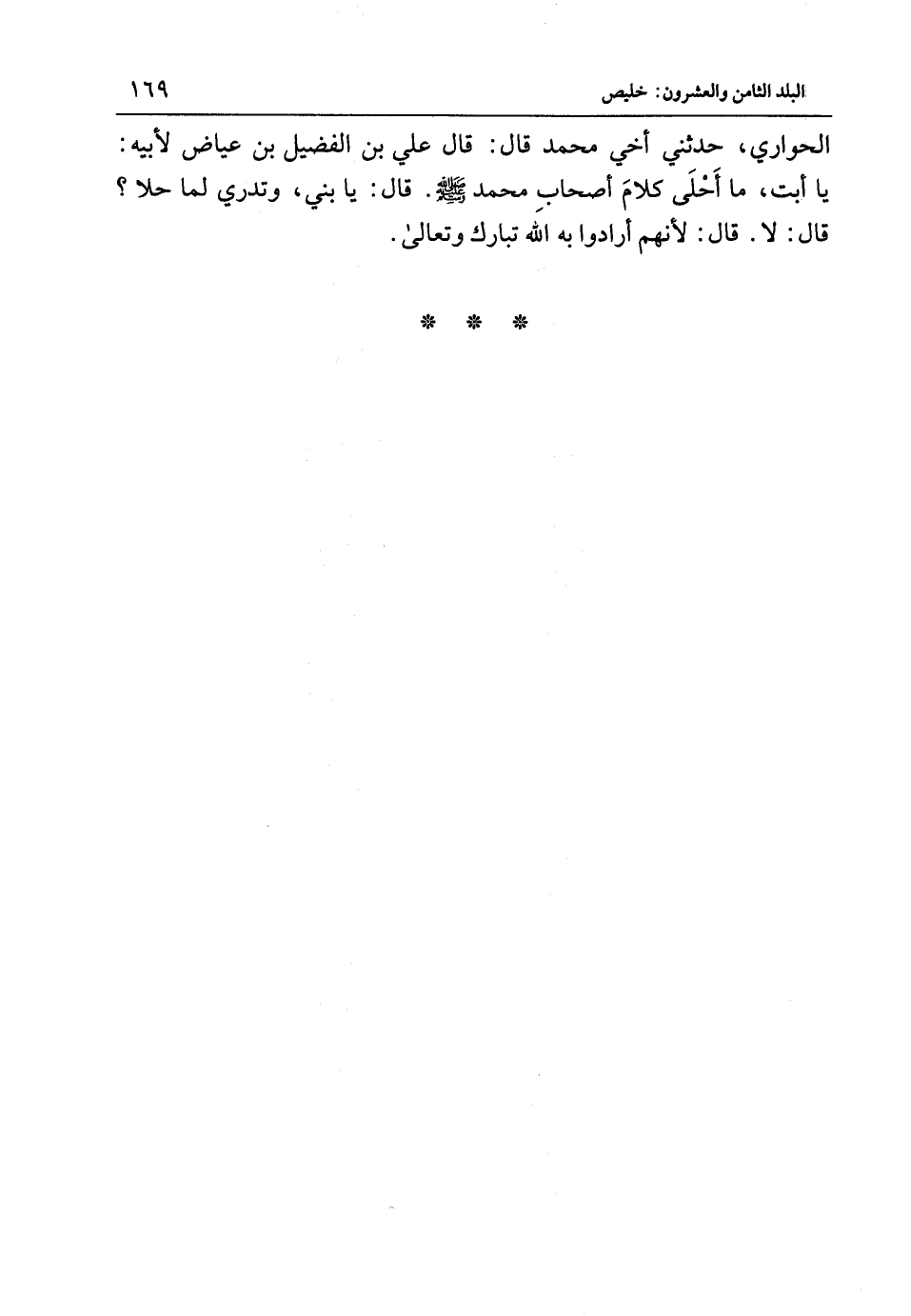 الْحوَاري حَدَّثَنِي أخي مُحَمَّد قَالَ قَالَ عَلِي بْن الفضيل بْن عِيَاض لِأَبِيهِ يَا أَبَت مَا أحلى كَلام أَصْحَاب مُحَمَّد {صَلَّى اللَّهُ عَلَيْهِ وَسَلَّمَ} قَالَ يَا بَنِي وَتَدْرِي لما حلا قَالَ لَا قَالَ لأَنهم أَرَادوا بِهِ اللَّه تبَارك وَتَعَالَى