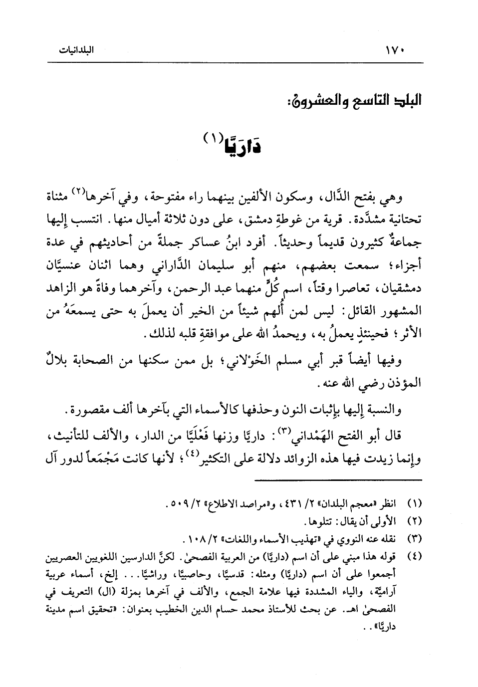 وَهِيَ بِفَتْح الدَّال وَسُكُون الْأَلفَيْنِ بَينهمَا رَاء مَفْتُوحَة وَفِي آخرهَا مثناة تَحْتَانِيَّة مُشَدّدَة قَرْيَة من غوطة دمشق عَلَى دون ثَلَاثَة أَمْيَال مِنْهَا انتسب إِلَيْهَا جَمَاعَة كَثِيرُونَ قَدِيما وحَدِيثا أفرد ابْن عَسَاكِر جملَة من أَحَادِيثهم فِي عدَّة أَجزَاء سَمِعت بَعْضهم مِنْهُم أَبُو سُلَيْمَان الدَّارَانِي وهما اثْنَان عنسيان دمشقيان تعاصرا وقتا اسْم كُل مِنْهُمَا عَبْد الرَّحْمَنِ وآخرهما وَفَاة هُوَ الزَّاهِد الْمَشْهُور الْقَائِل لَيْسَ لمن ألهم شَيْئًا من الْخَيْر أَن يعْمل بِهِ حَتَّى يسمعهُ من الْأَثر فَحِينَئِذٍ يعْمل بِهِ ويحمد اللَّه عَلَى مُوَافقَة قلبه لِذَلِكَ وفيهَا أَيْضا قبر أَبِي مُسْلِم الْخَولَانِيّ بَل مِمَّن سكنها من الصَّحَابَة بِلَال الْمُؤَذّن رَضِيَ اللَّهُ عَنْهُ وَالنِّسْبَة إِلَيْهَا بِإِثْبَات النُّون وحذفها كالأسماء الَّتِي بآخرها ألف مَقْصُورَة قَالَ أَبُو الْفَتْحِ الْهَمدَانِي داريا وَزنهَا فعليا من الدَّار وَالْألف للتأنيث وَإِنَّمَا زيدت فِيهَا هَذِه الزَّوَائِد دلَالَة عَلَى التكثير لِأَنَّهَا كَانَت مجمعا لدور آل