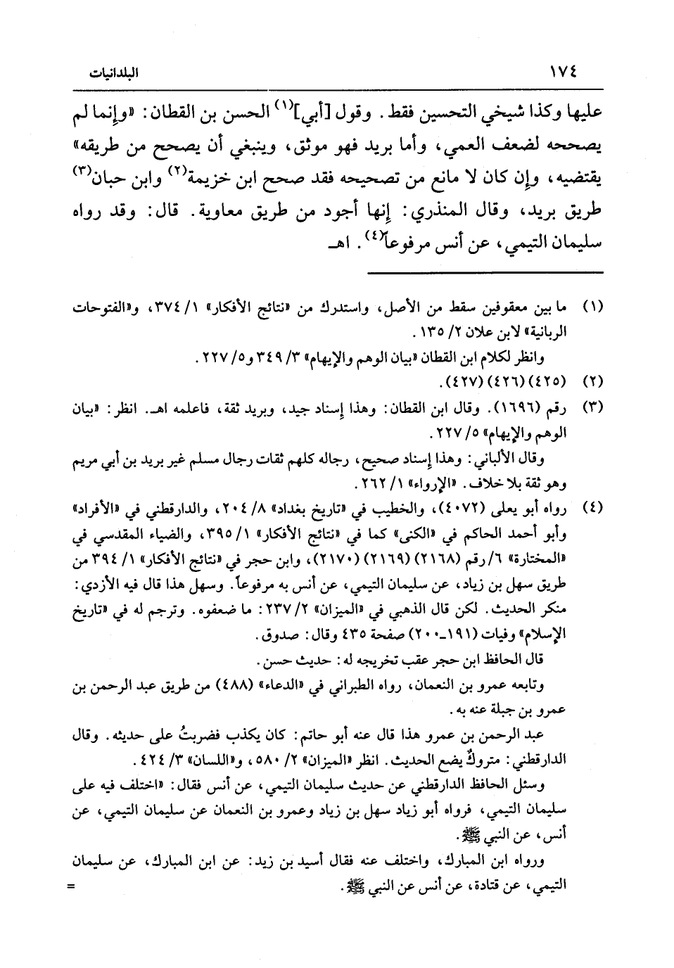 عَلَيْهَا وَكَذَا شَيْخي التحسين فَقَط وَقَول أَبِي الْحَسَن بْن الْقطَّان وَإِنَّمَا لَمْ يُصَحِّحهُ لضعف الْعمي وَأَمَّا بريد فَهُوَ موثق وَيَنْبَغِي أَن يصحح من طَرِيقه يَقْتَضِيهِ وَإِن كَانَ لَا مَانع من تَصْحِيحه فَقَدْ صحّح ابْن خُزَيْمَة وَابْن حبَان طَرِيق بريد وَقَالَ الْمُنْذِرِيّ إِنَّهَا أَجود من طَرِيق مُعَاوِيَة قَالَ وَقَدْ رَوَاهُ سُلَيْمَان التَّيْمِيّ عَن أنس مَرْفُوعا اه