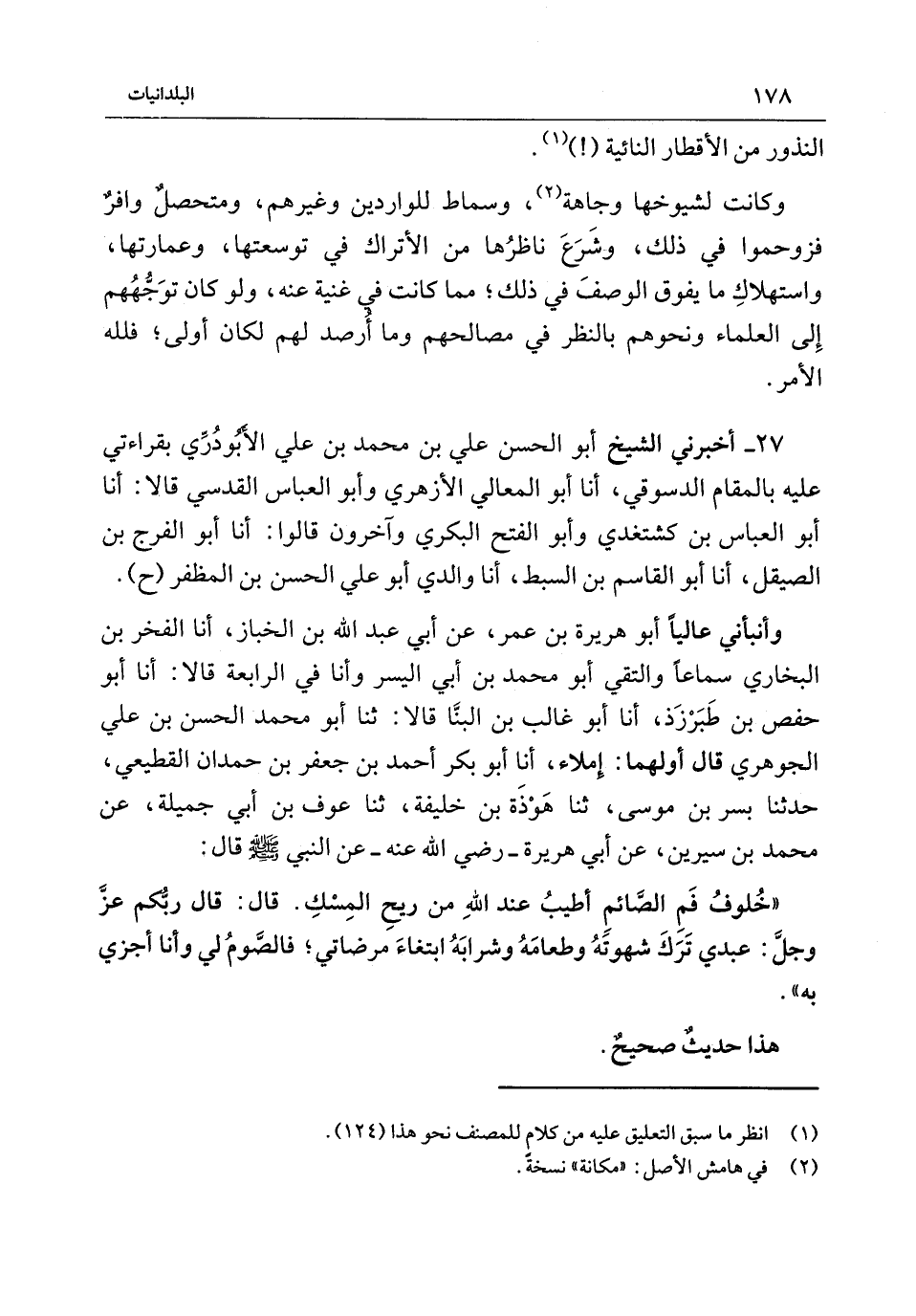 وَأَنْبَأَنِي عَالِيًا أَبُو هُرَيْرَةَ بْنُ عُمَرَ عَنْ أَبِي عَبْدِ اللَّهِ بْنِ الْخَبَّازِ أَنا الْفَخْرُ بْنُ الْبُخَارِيِّ سَمَاعًا وَالتَّقِيُّ أَبُو مُحَمَّدِ بْنُ أَبِي الْيُسْرِ وَأَنَا فِي الرَّابِعَةِ قَالا أَنا أَبُو حَفْصِ بن طبرزذ أَنا أَبُو غَالِبِ بْنُ الْبَنَّا قَالا ثَنَا أَبُو مُحَمَّدٍ الْحَسَنُ بْنُ عَلِيٍّ الْجَوْهَرِيُّ قَالَ أَوَّلَهُمَا إِمْلاءً أَنا أَبُو بَكْرٍ أَحْمَدُ بْنُ جَعْفَرِ بْنِ حَمْدَانَ الْقَطِيعِيُّ حَدَّثَنَا بُسْرُ بْنُ مُوسَى ثَنَا هَوْذَةُ بْنُ خَلِيفَةَ ثَنَا عَوْفُ بْنُ أَبِي جَمِيلَةَ عَنْ مُحَمَّدِ بْنِ سِيرِينَ عَنْ أَبِي هُرَيْرَة - رَضِيَ اللَّهُ عَنْهُ - عَنِ النَّبِيِّ {صَلَّى اللَّهُ عَلَيْهِ وَسَلَّمَ} قَالَ خُلُوفُ فَمِ الصَّائِمِ أَطْيَّبُ عِنْدَ اللَّهِ مِنْ رِيحِ الْمِسْكِ قَالَ قَالَ رَبُّكُمْ عَزَّ وَجَلَّ عَبْدِي تَرَكَ شَهْوَتَهُ وَطَعَامَهُ وَشَرَابَهُ ابْتِغَاءَ مَرْضَاتِي فَالصَّوْمُ لِي وَأَنَا أَجْزِي بِهِ هَذَا حَدِيثٌ صَحِيحٌ
