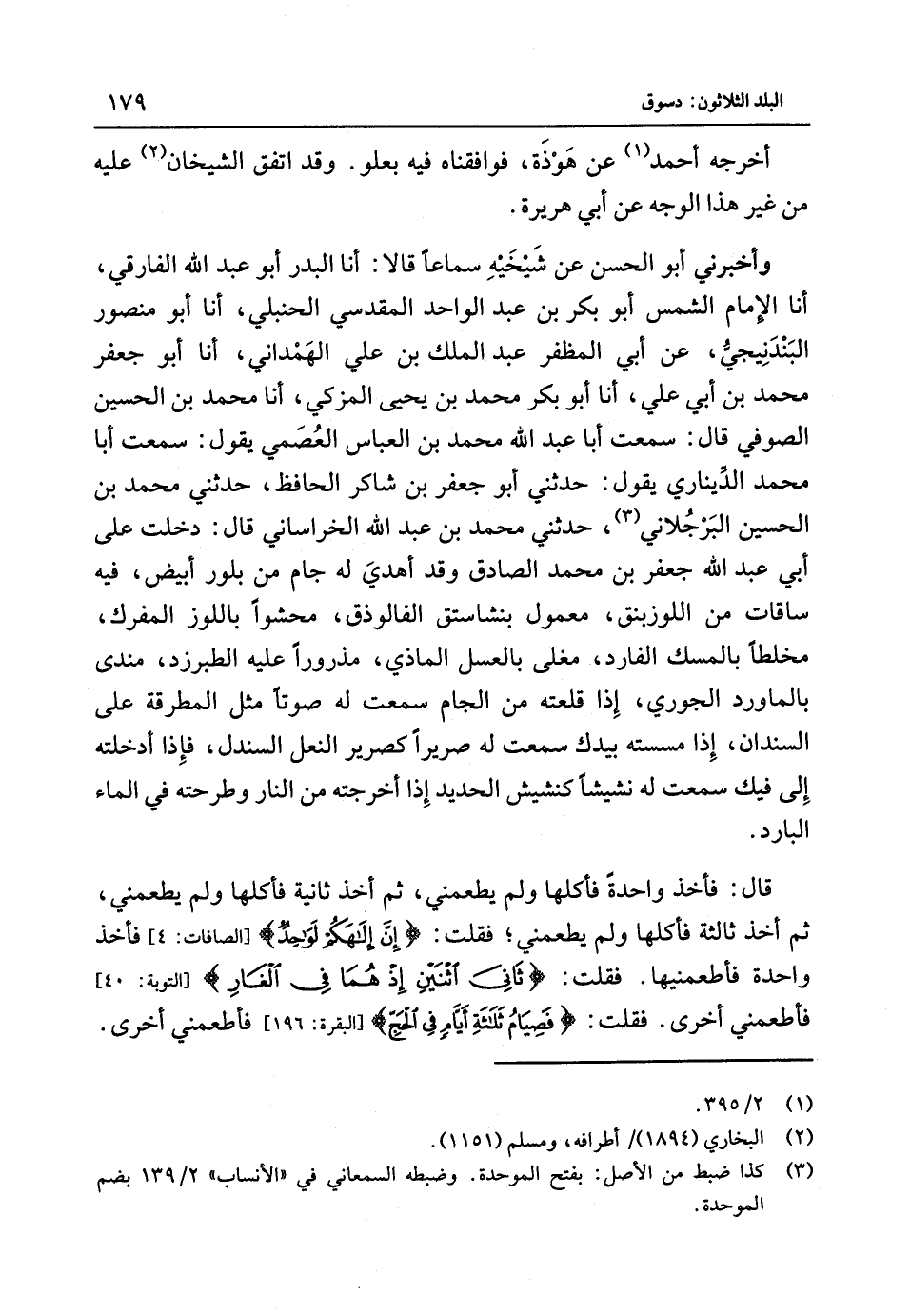 أَخْرَجَهُ أَحْمَدُ عَنْ هَوْذَةَ فَوَافَقْنَاهُ فِيهِ بِعُلُوٍّ وَقَدِ اتَّفَقَ الشَّيْخَانِ عَلَيْهِ مِنْ غَيْرِ هَذَا الْوَجْهِ عَنْ أَبِي هُرَيْرَةَ وَأَخْبَرَنِي أَبُو الْحَسَنِ عَنْ شيخيه سَمَاعًا قَالا أَنا الْبَدْر أَبُو عَبْد اللَّهِ الفارقي أَنا الإِمَام الشَّمْس أَبُو بَكْر بْن عَبْد الْوَاحِد الْمَقْدِسِي الْحَنْبَلِيّ أَنا أَبُو مَنْصُور الْبَنْدَنِيجِيّ عَنْ أَبِي المظفر عَبْد الْملك بْن عَلِي الْهَمدَانِي أَنا أَبُو جَعْفَر مُحَمَّد بْن أَبِي عَلِي أَنا أَبُوُ بَكْرٍ مُحَمَّدُ بْنُ يَحْيَى الْمُزَكي أَنا مُحَمَّد بْن الْحُسَيْن الصُّوفِي قَالَ سَمِعت أَبَا عَبْد اللَّهِ مُحَمَّد بْن الْعَبَّاس العصمي يَقُول سَمِعت أَبَا مُحَمَّد الديناري يَقُول حَدَّثَنِي أَبُو جَعْفَر بْن شَاكر الْحَافِظ حَدَّثَنِي مُحَمَّد بْن الْحُسَيْن البرجلاني حَدَّثَنِي مُحَمَّد بْن عَبْد اللَّهِ الْخُرَاسَانِي قَالَ دخلت عَلَى أَبِي عَبْد اللَّهِ جَعْفَر بْن مُحَمَّد الصَّادِق وَقَدْ أهدي لَهُ جَام من بلور أَبيض فِيهِ ساقات من اللوزبنق مَعْمُول بنشاستق الفالوذق محشوا باللوز المفرك مخلطا بالمسك الفارد مغلي بالعسل الماذي مذرورا عَلَيْهِ الطبرزد مندي بالماورد الْجُورِي إِذَا قلعته من الْجَام سَمِعت لَهُ صَوتا مثل المطرقة عَلَى السندان إِذَا مَسسْته بِيَدِك سَمِعت لَهُ صَرِيرًا كَصَرِيرِ النَّعْل السندل فَإِذَا أدخلته إِلَى فِيك سَمِعت لَهُ نشيشا كنشيش الْحَدِيد إِذَا أخرجته من النَّار وطرحته فِي المَاء الْبَارِد قَالَ فَأخذ وَاحِدَة فَأكلهَا وَلَمْ يطعمني ثمَّ أَخذ الثَّانِيَة فَأكلهَا وَلَمْ يطعمني ثُمَّ أَخذ ثَالِثَة فَأكلهَا وَلَمْ يطعمني فَقُلْتُ (إِنَّ إِلَهَكُمْ لَوَاحِدٌ) الصافات 4 فَأخذ وَاحِدَة فأطعمنيها فَقُلْتُ (ثَانِيَ اثْنَيْنِ إِذْ هُمَا فِي الْغَارِ) التَّوْبَة 40 فأطعمني أُخْرَى فَقُلْتُ (فَصِيَامُ ثَلاثَةِ أَيَّامٍ فِي الْحَجِّ) الْبَقَرَة 196 فأطعمني أُخْرَى