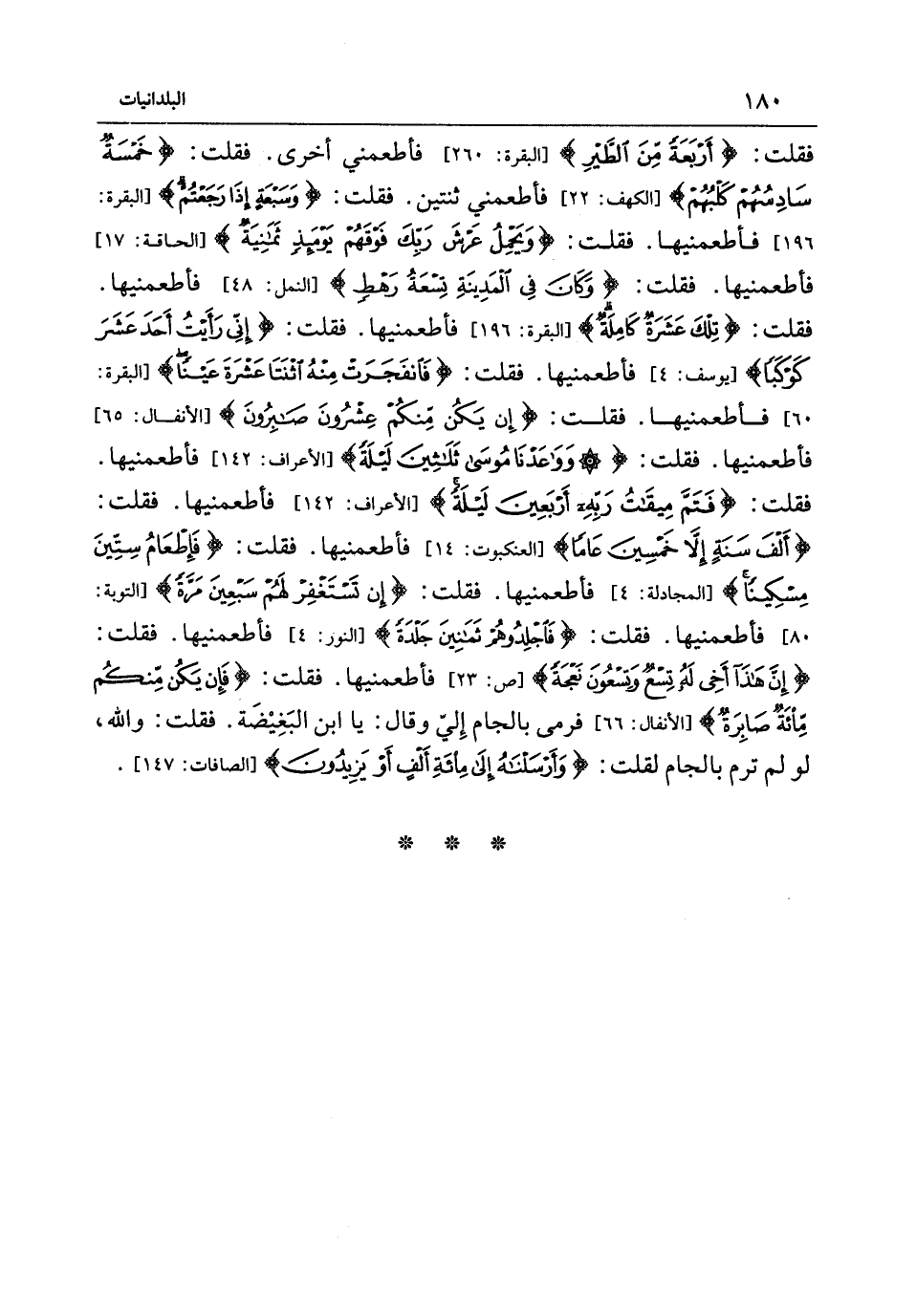 فَقُلْتُ (أَرْبَعَةً مِنَ الطَّيْرِ) الْبَقَرَة 260 فأطعمني أُخْرَى فَقُلْتُ (خَمْسَةٌ سَادِسُهُمْ الْكَلْب) الْكَهْف 22 فأطعمني ثِنْتَيْنِ فَقُلْتُ (وَسَبْعَةٍ إِذَا رَجَعْتُمْ) الْبَقَرَة 196 فأطعمنيها فَقُلْتُ (وَيَحْمِلُ عَرْشَ رَبِّكَ فَوْقَهُمْ يَوْمَئِذٍ ثَمَانِيَةٌ) الحاقة 17 فأطعمنيها فَقُلْتُ (وَكَانَ فِي الْمَدِينَةِ تِسْعَةُ رَهْطٍ) النَّمْل 48 فأطعمنيها فَقُلْتُ (تِلْكَ عَشَرَةٌ كَامِلَةٌ) الْبَقَرَة 196 فأطعمنيها فَقُلْتُ (إِنِّي رَأَيْتُ أَحَدَ عَشَرَ كَوْكَبًا) يُوسُف 4 فأطعمنيها فَقُلْتُ (فَانْفَجَرَتْ مِنْهُ اثْنَتَا عَشْرَةَ عَيْنًا) الْبَقَرَة 60 فأطعمنيها فَقُلْتُ (إِنْ يَكُنْ مِنْكُمْ عِشْرُونَ صَابِرُونَ) الْأَنْفَال 65 فأطعمنيها فَقُلْتُ (وَوَاعَدْنَا مُوسَى ثَلاثِينَ لَيْلَةً) الْأَعْرَاف 142 فأطعمنيها فَقُلْتُ (فَتَمَّ مِيقَاتُ رَبِّهِ أَرْبَعِينَ لَيْلَةً) الْأَعْرَاف 142 فأطعمنيها فَقُلْتُ (أَلْفَ سَنَةٍ إِلا خَمْسِينَ عَامًا) العنكبوت 14 فأطعمنيها فَقُلْتُ (فَإِطْعَامُ سِتِّينَ مِسْكِينًا) المجادلة 4 فأطعمنيها فَقُلْتُ (إِنْ تَسْتَغْفِرْ لَهُمْ سَبْعِينَ مَرَّةً) التَّوْبَة 80 فأطعمنيها فَقُلْتُ (فَاجْلِدُوهُمْ ثَمَانِينَ جَلْدَةً) النُّور 4 فأطعمنيها فَقُلْتُ (إِنَّ هَذَا أَخِي لَهُ تِسْعٌ وَتِسْعُونَ نَعْجَةً) ص 23 فأطعمنيها فَقُلْتُ (فَإِنْ يَكُنْ مِنْكُمْ مِائَةٌ صَابِرَةٌ) الْأَنْفَال 66 فَرمي بالجام إِلَيّ وَقَالَ يَا ابْن البغيضة فَقُلْتُ وَالله لَو لَمْ ترم بالجام لَقلت (وَأَرْسَلْنَاهُ إِلَى مِائَةِ أَلْفٍ أَوْ يَزِيدُونَ) الصافات 147