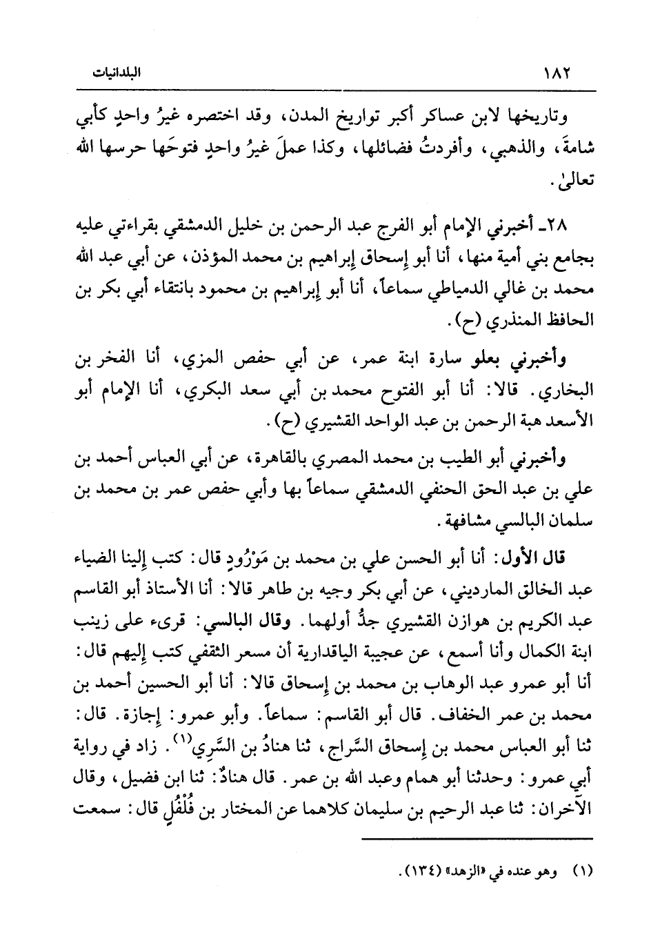 28 - أَخْبَرَنِي الإِمَامُ أَبُو الْفَرَجِ عَبْدُ الرَّحْمَنِ بْنُ خَلِيلٍ الدِّمَشْقِيُّ بِقَرَاءَتِي عَلَيْهِ بِجَامِعِ بَنِي أُمَيَّةَ مِنْهَا أَنا أَبُو إِسْحَاقَ إِبْرَاهِيمُ بْنُ مُحَمَّدِ الْمُؤَذِّنُ عَنْ أَبِي عَبْدِ اللَّهِ مُحَمَّدِ بْنِ غَالِي الدِّمْيَاطِيِّ سَمَاعًا أَنا أَبُو إِبْرَاهِيمَ بْنُ مَحْمُودٍ بِانْتِقَاءِ أَبِي بَكْرِ بْنِ الْحَافِظِ الْمُنْذِرِيّ (ح)