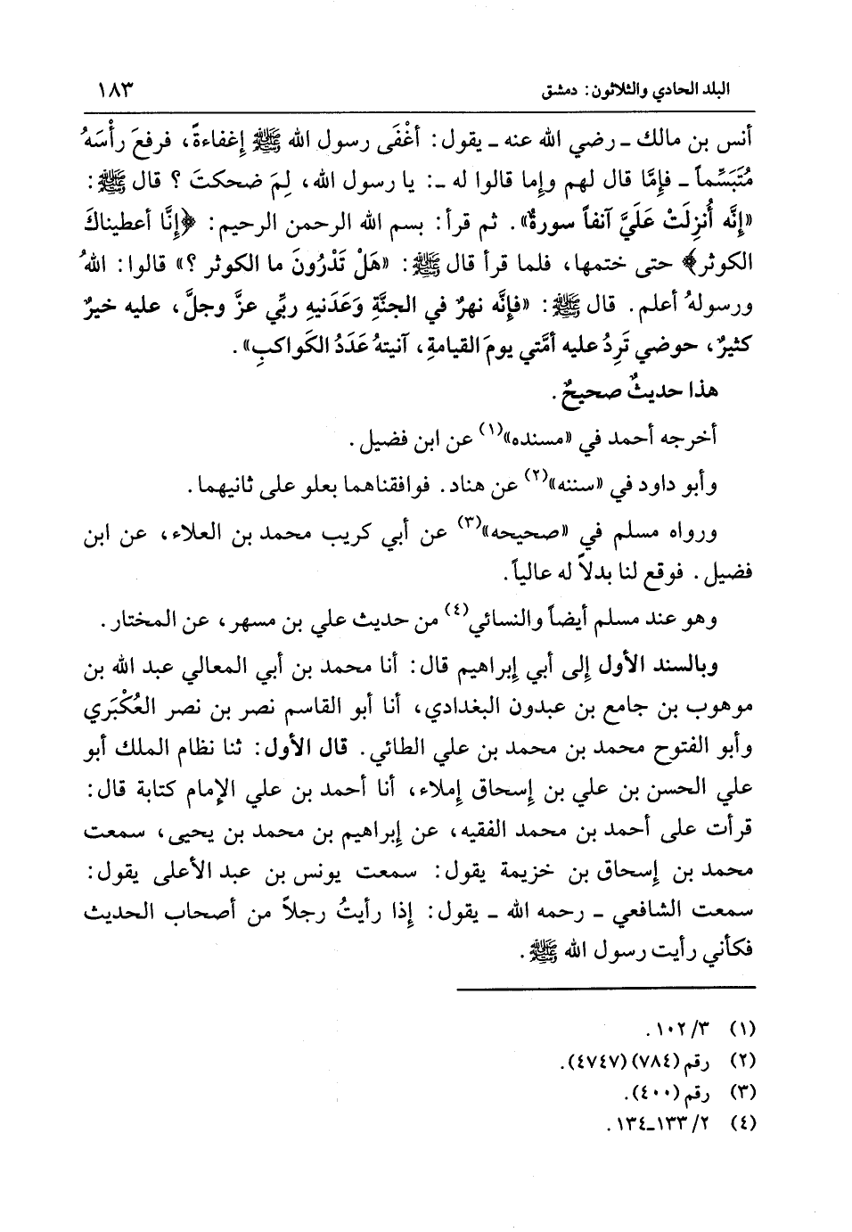 أَنَسَ بْنَ مَالِكٍ - رَضِيَ اللَّهُ عَنْهُ - يَقُولُ أَغْفَى رَسُولُ اللَّهِ {صَلَّى اللَّهُ عَلَيْهِ وَسَلَّمَ} إِغْفَاءَةً فَرَفَعَ رَأْسَهُ مُتَبَسِّمًا - فَإِمَّا قَالَ لَهُمْ وَإِمَّا قَالُوا لَهُ - يَا رَسُولَ اللَّهِ لَمْ ضَحِكْتَ قَالَ {صَلَّى اللَّهُ عَلَيْهِ وَسَلَّمَ} إِنَّهُ أُنْزِلَتْ عَلِيَّ آنِفًا سُورَةٌ ثُمَّ قَرَأ بِسْمِ اللَّهِ الرَّحْمَنِ الرَّحِيمِ (إِنَّا إعطيناك الْكَوْثَر) حَتَّى خَتَمَهَا فَلَمَّا قَرَأَ قَالَ {صَلَّى اللَّهُ عَلَيْهِ وَسَلَّمَ} هَلْ تَدْرُونَ مَا الْكَوْثَرُ قَالُوا اللَّهُ وَرَسُولُهُ أَعْلَمُ قَالَ {صَلَّى اللَّهُ عَلَيْهِ وَسَلَّمَ} فَإِنَّهُ نَهْرٌ فِي الْجَنَّةِ وَعَدَنِيهِ رِبِّي عَزَّ وَجَلَّ عَلَيْهِ خَيْرٌ كَثِيرٌ حَوْضِي تَرِدُ عَلَيْهِ أُمَّتِي يَوْمَ الْقِيَامَةِ آنِيَتُهُ عَدَدَ الْكَوَاكِبِ هَذَا حَدِيثٌ صَحِيحٌ أخرجه أَحْمَد فِي مُسْنده عَنِ ابْن فُضَيْل وَأَبُو دَاوُد فِي سنَنه عَنْ هناد فوافقناهما بِعُلُوٍّ عَلَى ثَانِيهمَا وَرَوَاهُ مُسْلِم فِي صَحِيحه عَنْ أَبِي كريب مُحَمَّد بْن الْعَلَاء عَنِ ابْن فُضَيْل فَوَقع لنا بَدَلا لَهُ عَالِيًا وَهُوَ عِنْدَ مُسْلِم أَيْضا وَالنَّسَائِيّ من حَدِيث عَلِي بْن مسْهر عَنِ الْمُخْتَار وَبِالسَّنَدِ الأَوَّل إِلَى أَبِي إِبْرَاهِيم قَالَ أَنا مُحَمَّد بْن أَبِي الْمَعَالِي عَبْد اللَّهِ بْن موهوب بْن جَامع بْن عبدون الْبَغْدَادِيُّ أَنا أَبُو الْقَاسِمِ نصر بْن نصر العكبري وَأَبُو الْفتُوح مُحَمَّد بْن مُحَمَّد بْن عَلِي الطَّائِي قَالَ الأَوَّل ثَنَا نظام الْملك أَبُو عَلِي الْحَسَن بْن عَلِي بْن إِسْحَاق إِمْلاءً أَنا أَحْمَد بْن عَلِي الإِمَام كِتَابَة قَالَ قَرَأت عَلَى أَحْمَد بْن مُحَمَّد الْفَقِيه عَنْ إِبْرَاهِيم بْن مُحَمَّد بْن يَحْيَى سَمِعت مُحَمَّد بْن إِسْحَاق بْن خُزَيْمَة يَقُول سَمِعت يُونُس بْن عَبْد الْأَعْلَى يَقُول سَمِعت الشَّافِعِي - رَحمَه اللَّه - يَقُول إِذَا رَأَيْت رجلا من أَصْحَاب الْحَدِيث فَكَأَنِّي رَأَيْت رَسُول الله e