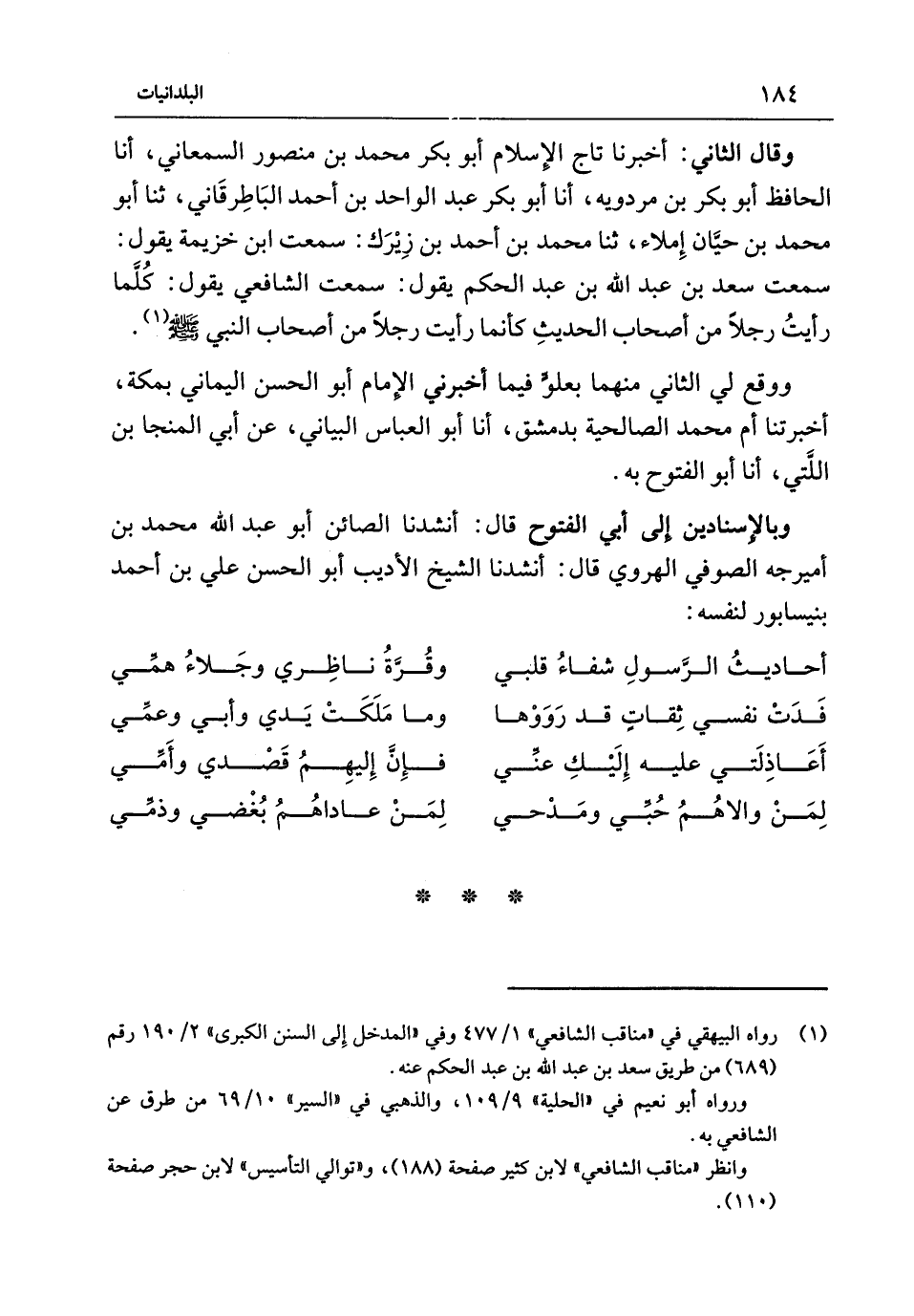 وَقَالَ الثَّانِي أَخْبَرَنَا تَاج الإِسْلام أَبُو بَكْرٍ مُحَمَّدُ بْنُ مَنْصُور السَّمْعَانِيّ أَنا الْحَافِظ أَبُو بَكْر بْن مرْدَوَيْه أَنا أَبُو بَكْر عَبْد الْوَاحِد بْن أَحْمَد الْبَاطِرْقَانِيُّ ثَنَا أَبُو مُحَمَّدِ بْنُ حَيَّانَ إِمْلاءً ثَنَا مُحَمَّد بْن أَحْمَد بْن زيرك سَمِعت ابْن خُزَيْمَة يَقُول سَمِعت سَعْد بْن عَبْد الله بن عبد الحكم يَقُول سَمِعت الشَّافِعِي يَقُول كلما رَأَيْت رجلا من أَصْحَاب الْحَدِيث كَأَنَّمَا رَأَيْت رجلا من أَصْحَاب النَّبِي {صَلَّى اللَّهُ عَلَيْهِ وَسَلَّمَ} وَوَقع لي الثَّانِي مِنْهُمَا بِعُلُوٍّ فِيمَا أَخْبرنِي الإِمَام أَبُو الْحسن الْيَمَانِيّ بِمَكَّة أَخْبَرَتْنَا أم مُحَمَّد الصالحية بِدِمَشْق أَنا أَبُو الْعَبَّاس الْبَيَانِي عَنْ أَبِي المنجا بْن اللتي أَنا أَبُو الْفتُوح بِهِ وبالإسنادين إِلَى أَبِي الْفتُوح قَالَ أنشدنا الصائن أَبُو عَبْدِ اللَّهِ مُحَمَّد بن أميرجه الصُّوفِي الْهَرَوِيّ قَالَ أنشدنا الشَّيْخ الأديب أَبُو الْحَسَنِ عَلِيُّ بْنُ أَحْمَد بنيسابور لنَفسِهِ أَحَادِيث الرَّسُول شِفَاء قلبِي