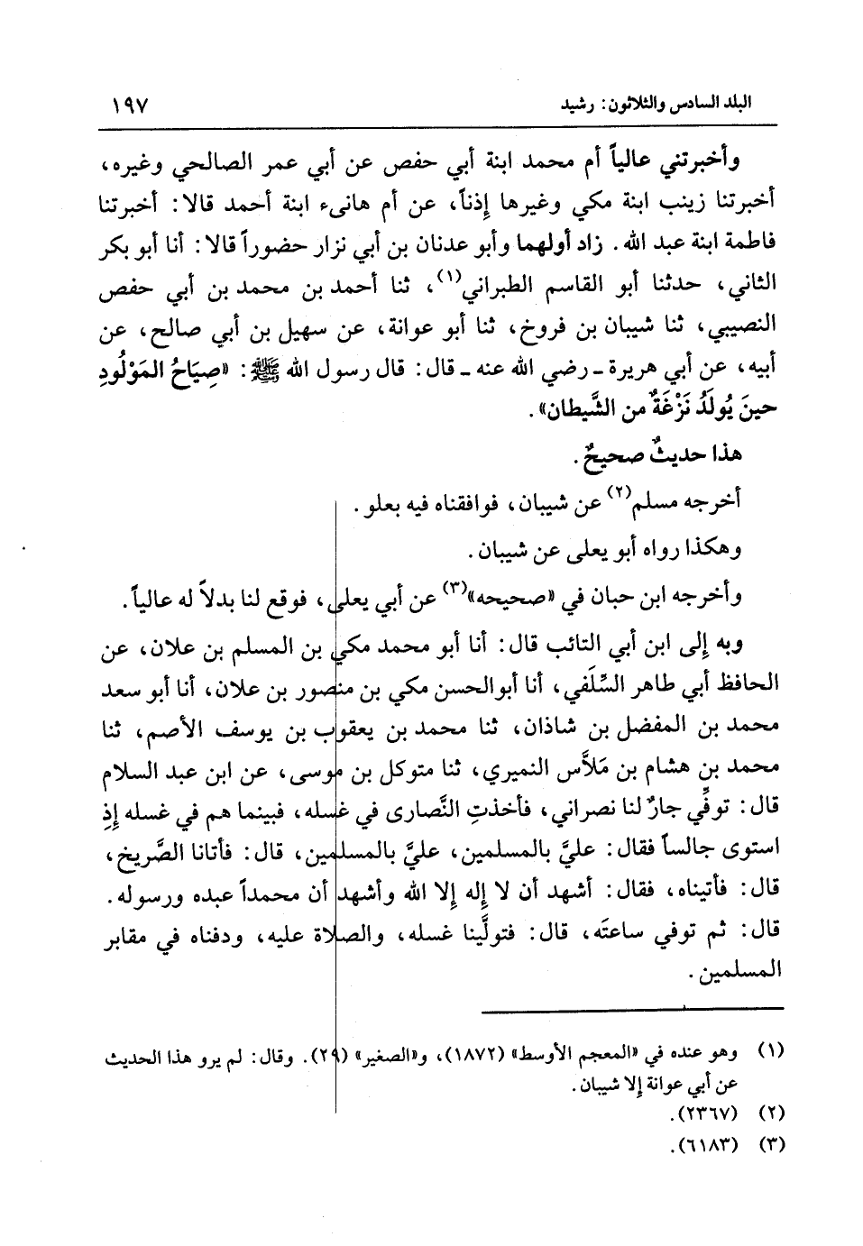 وَأَخْبَرَتْنِي عَالِيًا أُمُّ مُحَمَّدٍ ابْنَةُ أَبِي حَفْصٍ عَنْ أَبِي عُمَرَ الصَّالِحِي وَغَيْرِهِ أَخْبَرَتْنَا زَيْنَبُ ابْنَةُ مَكِّيٍّ وَغَيْرُهَا إِذْنًا عَنْ أُمِّ هَانِئِ ابْنَةِ أَحْمَدَ قَالا أَخْبَرَتْنَا فَاطِمَةُ ابْنَةُ عَبْدِ اللَّهِ زَادَ أَوَّلَهُمَا وَأَبُو عَدْنَانَ بْنُ أَبِي نِزَارٍ حُضُورًا قَالا أَنا أَبُو بَكْرٍ الثَّانِي حَدَّثَنَا أَبُو الْقَاسِمِ الطَّبَرَانِيُّ ثَنَا أَحْمَدُ بْنُ مُحَمَّدِ بْنِ أَبِي حَفْصٍ النَّصِيبِيُّ ثَنَا شَيْبَانُ بْن فَرُّوخٍ ثَنَا أَبُو عَوَانَةَ عَنْ سُهَيْلِ بْنِ أَبِي صَالِحٍ عَنْ أَبِيهِ عَنْ أَبِي هُرَيْرَةَ - رَضِيَ اللَّهُ عَنْهُ - قَالَ قَالَ رَسُولَ اللَّهَ {صَلَّى اللَّهُ عَلَيْهِ وَسَلَّمَ} صِيَاحُ الْمَوْلُودِ حِينَ يُولَدُ نزغة مِنَ الشَّيْطَانِ هَذَا حَدِيثٌ صَحِيحٌ أَخْرَجَهُ مُسْلِمٌ عَنْ شَيْبَانَ فَوَافَقْنَاهُ فِيهِ بِعُلُوٍّ وَهَكَذَا رَوَاهُ أَبُو يَعْلَى عَنْ شَيْبَانَ وَأْخَرَجَهُ ابْنُ حِبَّانَ فِي صَحِيحِهِ عَنْ أَبِي يَعْلَى فَوَقَعَ لَنَا بَدَلا لَهُ عَالِيًا وَبِهِ إِلَى ابْن أَبِي التائب قَالَ أَنا أَبُو مُحَمَّد مكي بْن الْمُسلم بْن عَلان عَنِ الْحَافِظِ أَبِي طَاهِرٍ السَّلَفِيِّ أَنا أَبُو الْحَسَنِ مكي بْن مَنْصُور بْن عَلان أَنا أَبُو سَعْد مُحَمَّد بْن الْمفضل بْن شَاذان ثَنَا مُحَمَّد بْن يَعْقُوب بْن يُوسُف الأَصَم ثَنَا مُحَمَّد بْن هِشَام بْن ملاس النميري ثَنَا متوكل بْن مُوسَى عَنْ ابْن عَبْد السَّلام قَالَ توفّي جَار لنا نَصْرَانِيّ فَأخذت النَّصَارَى فِي غسله فَبَيْنَمَا هم فِي غسله إِذْ اسْتَوَى جَالِسا فَقَالَ عَلِي بِالْمُسْلِمين عَلِي بِالْمُسْلِمين قَالَ فَأَتَانَا الصَّرِيخ قَالَ فأتيناه فَقَالَ أشهد أَن لَا إِلَه إِلَّا اللَّه وَأشْهد أَن مُحَمَّدًا عَبده وَرَسُوله قَالَ ثُمَّ توفّي سَاعَته قَالَ فتولينا غسله وَالصَّلَاة عَلَيْهِ ودفناه فِي مَقَابِر الْمُسْلِمِينَ