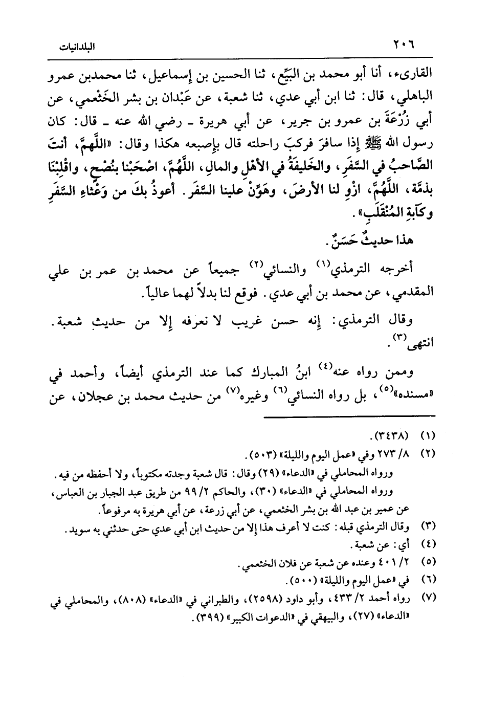 الْقَارِئُ أَنا أَبُو مُحَمَّدِ بْنُ الْبَيِّعِ ثَنَا الْحُسَيْنُ بْنُ إِسْمَاعِيلَ ثَنَا مُحَمَّدُ بْنُ عَمْرٍو الْبَاهِلِيُّ قَالَ ثَنَا ابْنُ أَبِي عَدِيٍّ ثَنَا شُعْبَةُ عَنْ عَبْدَانَ بْنِ بِشْرٍ الْخَثْعَمِيِّ عَنْ أَبِي زُرْعَةَ بْنِ عَمْرِو بْنِ جَرِيرٍ عَنْ أَبِي هُرَيْرَةَ - رَضِيَ اللَّهُ عَنْهُ - قَالَ كَانَ رَسُولُ اللَّهِ {صَلَّى اللَّهُ عَلَيْهِ وَسَلَّمَ} إِذَا سَافَرَ فَرَكِبَ رَاحِلَتَهُ قَالَ بِإِصْبَعِهِ هَكَذَا وَقَالَ اللَّهُمَّ أَنْتَ الصَّاحِبُ فِي السَّفَرِ وَالْخَلِيفَةُ فِي الأَهْلِ وَالْمَالِ اللَّهُمَّ اصْحَبْنَا بِنُصْحٍ وَاقْلِبْنَا بِذِّمَّةٍ اللَّهُمَّ ازْوِ لَنَا الأَرْضَ وَهَوِّنْ عَلَيْنَا السَّفَرَ أَعُوذُ بِكَ مِنْ وَعَثَاءِ السَّفَرِ وَكَآبَةِ الْمُنْقَلَبِ هَذَا حَدِيثٌ حَسَنٌ أَخْرَجَهُ التِّرْمِذِيُّ وَالنَّسَائِيُّ جَمِيعًا عَنْ مُحَمَّدِ بْنِ عُمَرَ بْنِ عَلِيٍّ الْمُقَدَّمِيِّ عَنْ مُحَمَّدِ بْنِ أَبِي عَدِيٍّ فَوَقَعَ لَنَا بَدَلا لَهُمَا عَاليًا وَقَالَ التِّرْمِذِيُّ إِنَّه حسن غَرِيب لَا نعرفه إِلَّا من حَدِيث شُعْبَة انْتهى وَمِمَّنْ رَوَاهُ عَنْهُ ابْن الْمُبَارك كَمَا عِنْدَ التِّرْمِذِي أَيْضا وَأَحْمَد فِي مُسْنده بَل رَوَاهُ النَّسَائِيّ وَغَيره من حَدِيث مُحَمَّد بْن عجلَان عَنْ