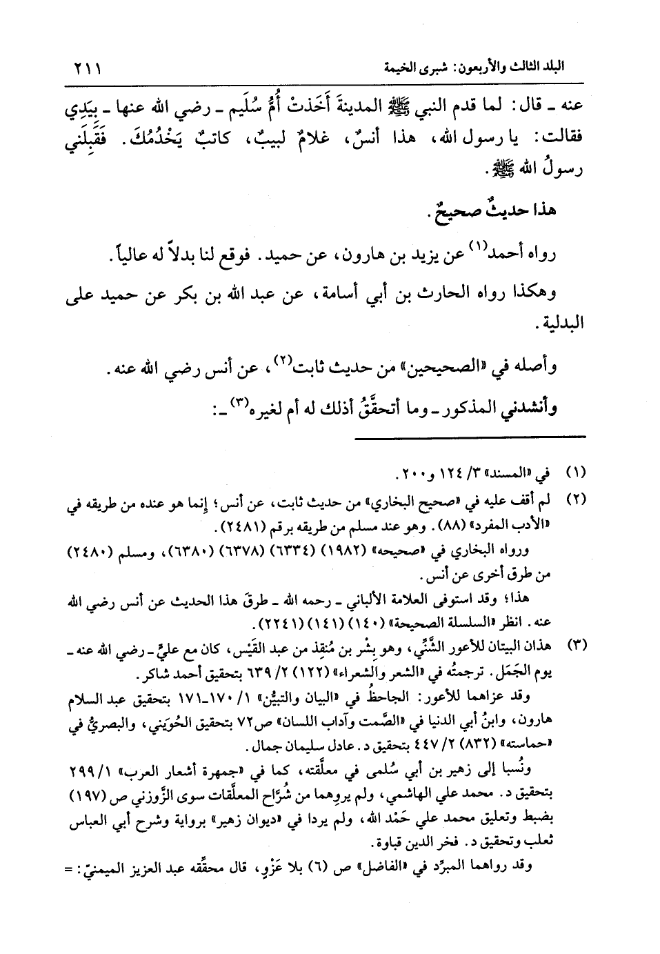 عَنْهُ - قَالَ لَمَّا قَدِمَ النَّبِيُّ {صَلَّى اللَّهُ عَلَيْهِ وَسَلَّمَ} الْمَدِينَةَ أَخَذَتْ أُمُّ سُلَيْمٍ - رَضِيَ اللَّهُ عَنْهَا - بِيَدِي فَقَالَتْ يَا رَسُولَ اللَّهِ هَذَا أَنَسٌ غُلامٌ لَبِيبٌ كَاتِبٌ يَخْدُمُكَ فَقَبِلَنِي رَسُولُ اللَّهِ {صَلَّى اللَّهُ عَلَيْهِ وَسَلَّمَ} هَذَا حَدِيثٌ صَحِيحٌ رَوَاهُ أَحْمَدُ عَنْ يَزِيدَ بْنِ هَارُونَ عَنْ حُمَيْدٍ فَوَقع لنا بَدَلا لَهُ عَالِيًا وَهَكَذَا رَوَاهُ الْحَارِث بْن أَبِي أُسَامَة عَنْ عَبْد اللَّهِ بْن بَكْر عَنْ حميد عَلَى الْبَدَلِيَّة وَأَصله فِي الصَّحِيحَيْنِ من حَدِيث ثَابت عَنْ أَنَس رَضِيَ اللَّهُ عَنْهُ وأنشدني الْمَذْكُور - وَمَا أتحقق أذلك لَهُ أم لغيره -