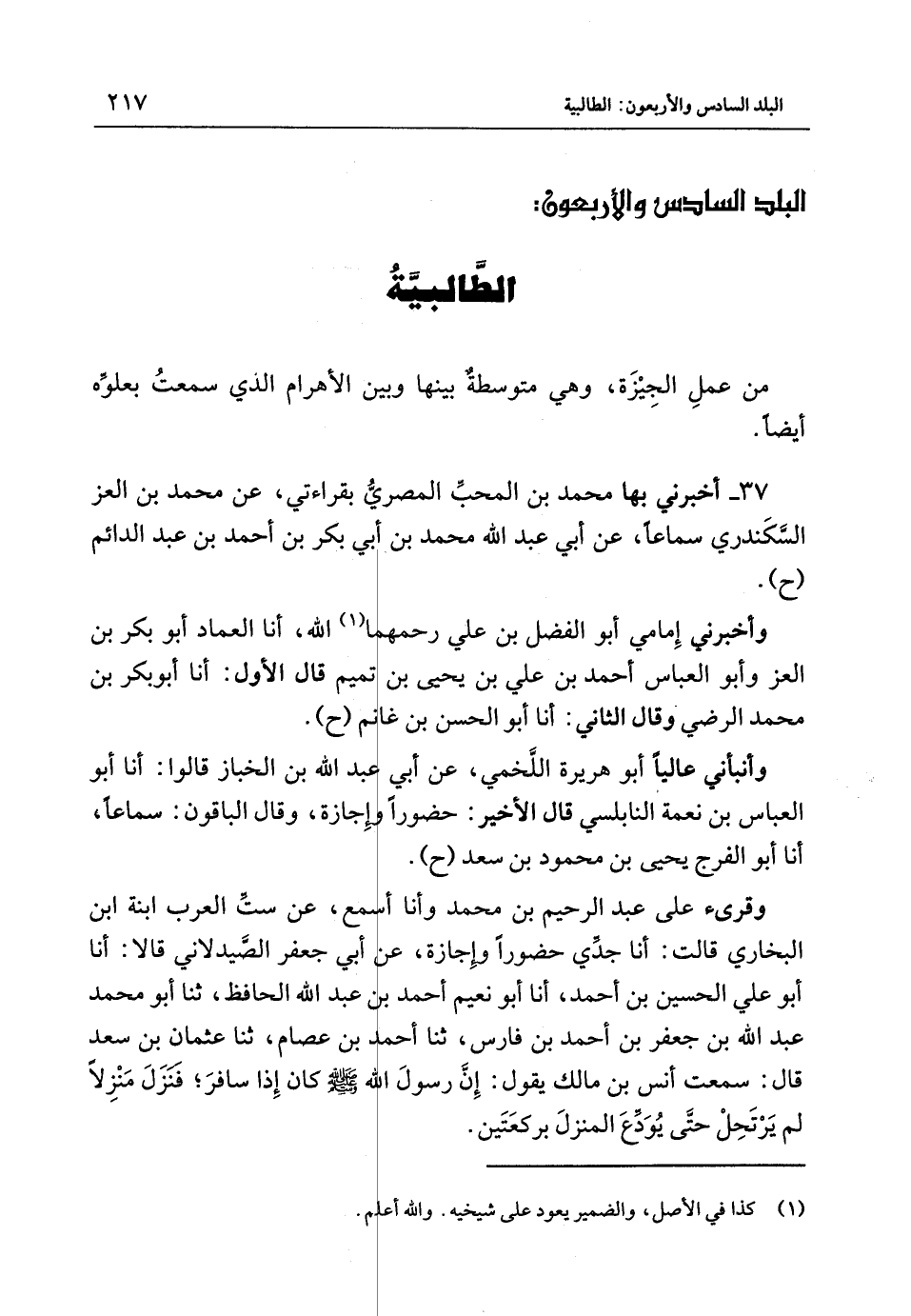 37 - أَخْبَرَنِي بِهَا مُحَمَّد بْنُ الْمُحِبِّ الْمِصْرِيُّ بِقَرَاءَتِي عَنْ مُحَمَّدِ بْنِ الْعِزِّ السَّكَنْدَرِيِّ سَمَاعًا عَنْ أَبِي عَبْدِ اللَّهِ مُحَمَّدِ بْنِ أَبِي بَكْرِ بْنِ أَحْمَدَ بْنِ عَبْدِ الدَّائِمِ (ح) وَأَخْبَرَنِي إِمَامِي أَبُو الْفَضْلِ بْنُ عَلِيٍّ رَحِمَهُمَا اللَّهُ أَنا الْعِمَادُ أَبُو بَكْرِ بن الْعِزّ وَأَبُو الْعَبَّاسِ أَحْمَدَ بْنِ عَلِيِّ بْنِ يَحْيَى بْنِ تَمِيمٍ قَالَ الأَوَّلُ أَنا أَبُو بَكْرِ بْنُ مُحَمَّدٍ الرَّضِيُّ وَقَالَ الثَّانِي أَنا أَبُو الْحَسَنِ بْنُ غَانِمٍ (ح)