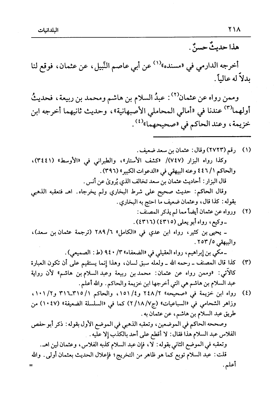 هَذَا حَدِيثٌ حَسَنٌ أَخْرَجَهُ الدَّارِمِيُّ فِي مُسْنَدِهِ عَنْ أَبِي عَاصِمٍ النَّبِيلِ عَنْ عُثْمَانَ فَوَقَعَ لَنَا بَدَلا لَهُ عَالِيًا وَمِمَّنْ رَوَاهُ عَنْ عُثْمَان عَبْد السَّلام بْن هَاشم وَمُحَمّد بْن ربيعَة فحَدِيث أَولهمَا عندنَا فِي أمالي الْمحَامِلِي الأصبهانية وحَدِيث ثَانِيهمَا أخرجه ابْن خُزَيْمَة وَعند الْحَاكِم فِي صَحِيحهمَا