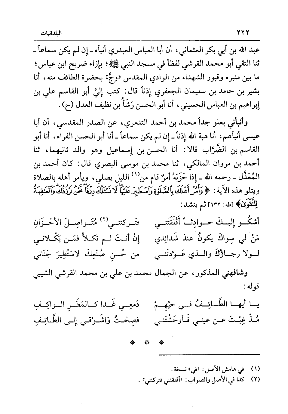 عَبْد اللَّهِ بْن أَبِي بَكْر العثماني أَن أَبَا الْعَبَّاس الْعَبدَرِي أنبأه - إِن لَمْ يكن سَمَاعًا - ثَنَا التَّقِي أَبُو مُحَمَّد الْقُرَشِي لفظا فِي مَسْجِد النَّبِي {صَلَّى اللَّهُ عَلَيْهِ وَسَلَّمَ} بِإِزَاءِ ضريح ابْن عَبَّاس مَا بَيْنَ منبره وقبور الشُّهَدَاء من الْوَادي الْمُقَدّس وَج بِحَضْرَة الطَّائِف مِنْهُ أَنا بشير بْن حَامِد بْن سُلَيْمَان الْجَعْفَرِي إِذْنًا قَالَ كتب إِلَيّ أَبُو الْقَاسِمِ عَلِيُّ بْنُ إِبْرَاهِيمَ بْن الْعَبَّاس الْحُسَيْنِي أَنا أَبُو الْحَسَنِ رشأ بْن نظيف الْعدْل (ح)