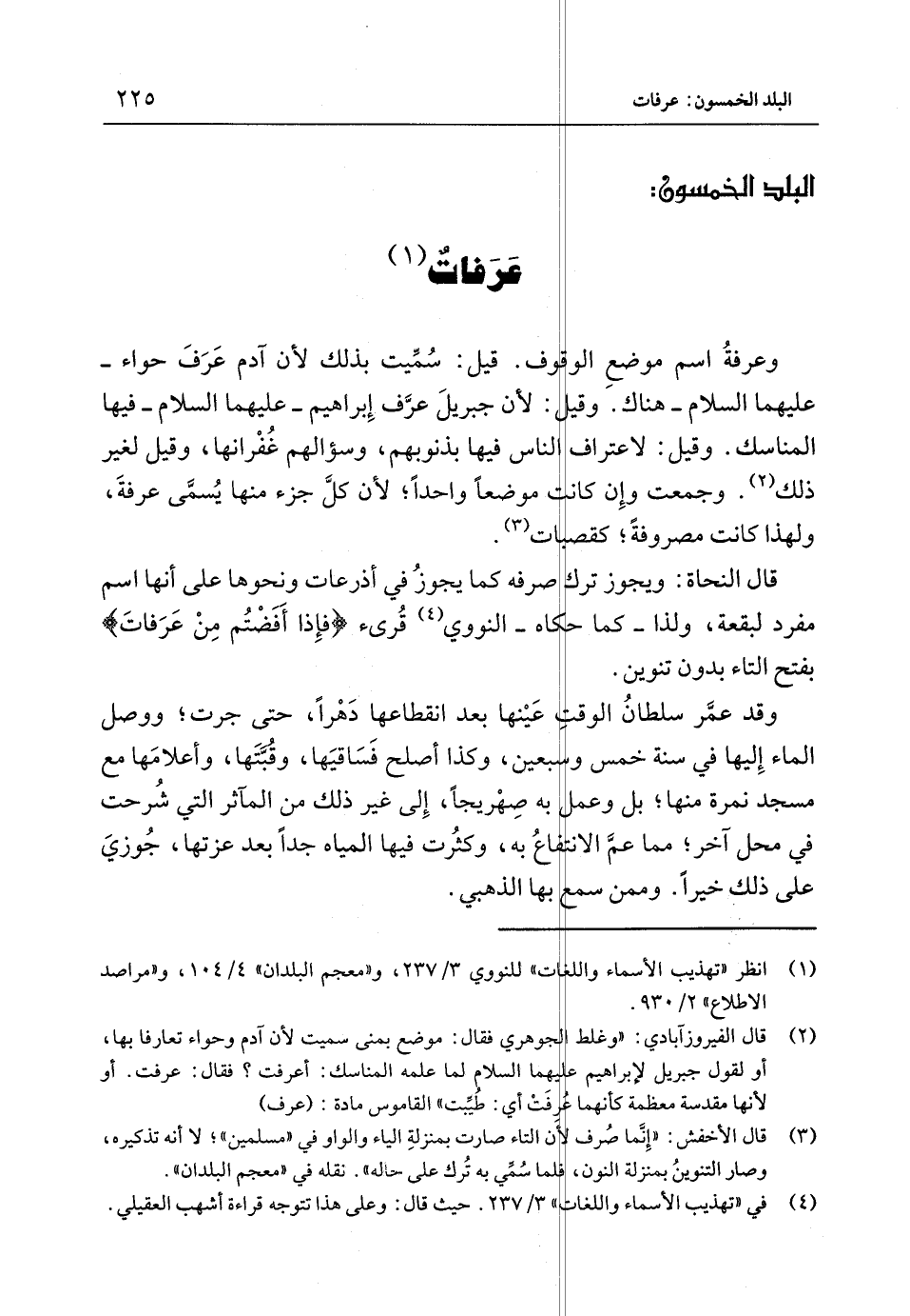 وعرفة اسْم مَوضِع الْوُقُوف قيل سميت بِذَلِكَ لِأَن آدم عرف حَوَّاء - عَلَيْهِمَا السَّلام - هُنَاكَ وَقيل لِأَن جِبْرِيل عرف إِبْرَاهِيم - عَلَيْهِمَا السَّلام - فِيهَا الْمَنَاسِك وَقيل لاعتراف النَّاس فِيهَا بِذُنُوبِهِمْ وسؤالهم غفرانها وَقيل لغير ذَلِك وجمعت وَإِن كَانَت موضعا وَاحِدًا لِأَن كُل جُزْء مِنْهَا يُسمى عَرَفَة وَلِهَذَا كَانَت مصروفة كقصبات قَالَ النُّحَاة وَيجوز ترك صرفه كَمَا يَجُوز فِي أَذْرُعَات وَنَحْوهَا عَلَى أَنَّهَا اسْم مُفْرد لبقعة وَلذَا - كَمَا حَكَاهُ - النَّوَوِيّ قرئَ (فَإِذَا أَفَضْتُمْ مِنْ عَرَفَاتٍ) بِفَتْح التَّاء بِدُونِ تَنْوِين وَقَدْ عُمَر سُلْطَان الْوَقْت عينهَا بَعْد انقطاعها دهرا حَتَّى جرت وَوصل المَاء إِلَيْهَا فِي سنة خمس وَسبعين وَكَذَا أصلح فساقيها وقبتها وأعلامها مَعَ مَسْجِد نمرة مِنْهَا بَل وَعمل بِهِ صهريجا إِلَى غَيْر ذَلِك من المآثر الَّتِي شرحت فِي مَحل آخر مِمَّا عَم الِانْتِفَاع بِهِ وَكَثُرت فِيهَا الْمِيَاه جدا بَعْد عزتها جوزي عَلَى ذَلِك خيرا وَمِمَّنْ سمع بهَا الذَّهَبِيّ