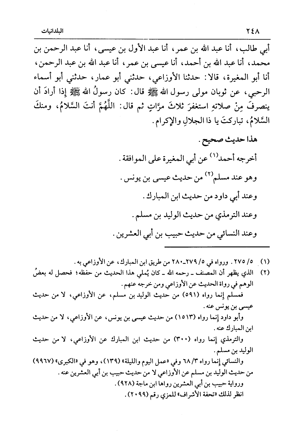 أَبِي طَالِبٍ أَنا عَبْدُ اللَّهِ بْنُ عُمَرَ أَنا عَبْدُ الأَوَّلِ بْنُ عِيسَى أَنا عَبْدُ الرَّحْمَنِ بْنُ مُحَمَّدٍ أَنا عَبْدُ اللَّهِ بْنُ أَحْمَدَ أَنا عِيسَى بْنُ عُمَرَ أَنا عَبْدُ اللَّهِ بْنُ عَبْدِ الرَّحْمَنِ أَنا أَبُو الْمُغِيرَةِ قَالا حَدَّثَنَا الأَوْزَاعِيُّ حَدَّثَنِي أَبُو عَمَّارٍ حَدَّثَنِي أَبُو أَسْمَاءَ الرَّحْبِيُّ عَنْ ثَوْبَانَ مَوْلَى رَسُولِ اللَّهِ {صَلَّى اللَّهُ عَلَيْهِ وَسَلَّمَ} قَالَ كَانَ رَسُولُ اللَّهِ {صَلَّى اللَّهُ عَلَيْهِ وَسَلَّمَ} إِذَا أَرَادَ أَنْ يَنْصَرِفَ مِنْ صَلاتِهِ اسْتَغْفَرَ ثَلاثَ مَرَّاتٍ ثُمَّ قَالَ اللَّهُمَّ أَنْتَ السَّلامُ وَمِنْكَ السَّلامُ تَبَارَكْتَ يَا ذَا الْجَلالِ وَالإِكْرَامِ هَذَا حَدِيثٌ صَحِيحٌ أَخْرَجَهُ أَحْمَدُ عَنْ أَبِي الْمُغِيرَةِ عَلَى الْمُوَافَقَةِ وَهُوَ عِنْدَ مُسْلِمٍ مِنْ حَدِيثِ عِيسَى بْنِ يُونُسَ وَعِنْدَ أَبِي دَاوُدَ مِنْ حَدِيثِ ابْنِ الْمُبَارَكِ وَعِنْدَ التِّرْمِذِيِّ مِنْ حَدِيثِ الْوَلِيدِ بْنِ مُسْلِمٍ وَعِنْدَ النَّسَائِيِّ مِنْ حَدِيثِ حَبِيبِ بْنِ أَبِي الْعِشْرِينَ