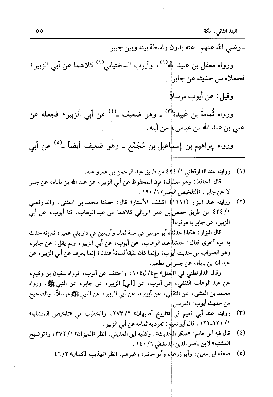 - رَضِيَ اللَّهُ عَنْهُم - عَنْهُ بِدُونِ وَاسِطَة بَينه وَبَين جُبَيْر وَرَوَاهُ معقل بْن عُبَيْد اللَّهِ وَأَيوب السّخْتِيَانِيّ كِلَاهُمَا عَنْ أَبِي الزُّبَيْر فجعلاه من حَدِيثه عَنْ جَابِر وَقيل عَنْ أَيُّوب مُرْسلا وَرَوَاهُ ثُمَامَة بْن عُبَيْدَة - وَهُوَ ضَعِيف - عَنْ أَبِي الزُّبَيْر فَجعله عَنْ عَلِي بْن عَبْد اللَّهِ بْن عَبَّاس عَنْ أَبِيهِ وَرَوَاهُ إِبْرَاهِيم بْن إِسْمَاعِيل بْن مجمع - وَهُوَ ضَعِيف أَيْضا - عَنْ أَبِي