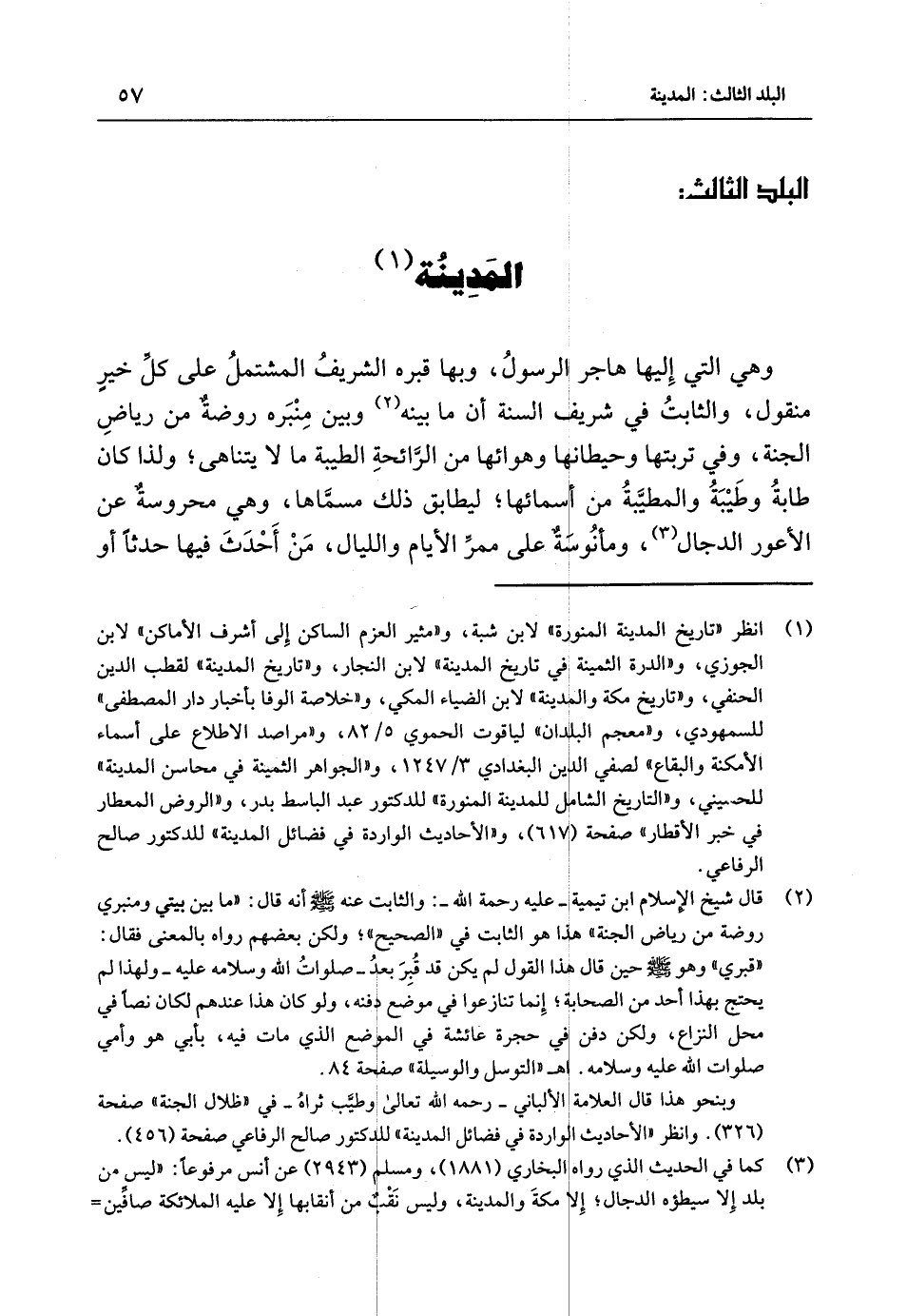 وَهِيَ الَّتِي إِلَيْهَا هَاجر الرَّسُول وَبهَا قَبره الشريف الْمُشْتَمل عَلَى كُل خير مَنْقُول وَالثَّابِت فِي شرِيف السّنة أَن مَا بَينه وَبَين منبره رَوْضَة من رياض الْجَنَّة وَفِي تربَتهَا وحيطانها وهوائها من الرَّائِحَة الطّيبَة مَا لَا يتناهى وَلذَا كَانَ طابة وطيبة والمطيبة من أسمائها ليطابق ذَلِكَ مسماها وَهِيَ محروسة عَنِ الْأَعْوَر الدَّجَّال ومأنوسة على ممر الْأَيَّام والليال من أحدث فِيهَا حَدثا أَوْ