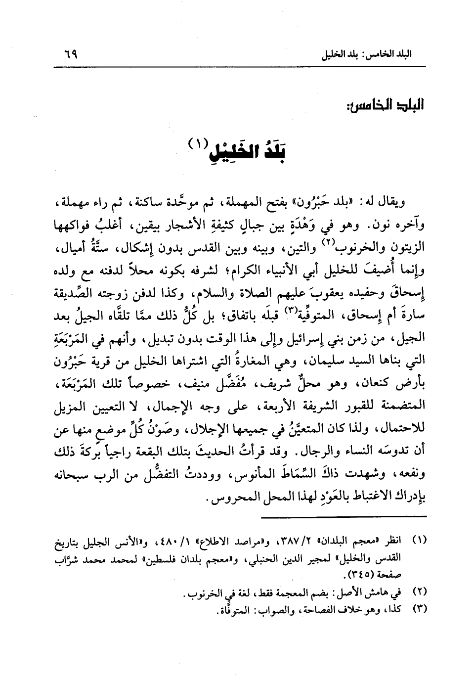 وَيُقَال لَهُ بلد حبرون بِفَتْح الْمُهْملَة ثُمَّ مُوَحدَة سَاكِنة ثُمَّ رَاء مُهْملَة وَآخره نون وَهُوَ فِي وهدة بَيْنَ جبال كثيفة الْأَشْجَار بِيَقِين أغلب فواكهها الزَّيْتُون والخرنوب والتين وَبَينه وَبَين الْقُدس بِدُونِ إِشْكَال سِتَّة أَمْيَال وَإِنَّمَا أضيف للخليل أَبِي الْأَنْبِيَاء الْكِرَام لشرفه بِكَوْنِهِ محلا لدفنه مَعَ وَلَده إِسْحَاق وحفيده يَعْقُوب عَلَيْهِم الصَّلَاة وَالسَّلَام وَكَذَا لدفن زَوجته الصديقة سارة أم إِسْحَاق المتوفية قبله بِاتِّفَاق بَل كُل ذَلِكَ مِمَّا تَلقاهُ الجيل بَعْد الجيل من زمن بَنِي إِسْرَائِيل وَإِلَى هَذَا الْوَقْت بِدُونِ تَبْدِيل وَأَنَّهُمْ فِي المربعة الَّتِي بناها السَّيِّد سُلَيْمَان وَهِيَ المغارة الَّتِي اشْتَرَاهَا الْخَلِيل من قَرْيَة حبرون بِأَرْض كنعان وَهُوَ مَحل شرِيف مفضل منيف خُصُوصا تِلْكَ المربعة المتضمنة للقبور الشَّرِيفَة الْأَرْبَعَة عَلَى وَجه الْإِجْمَال لَا التَّعْيِين المزيل للاحتمال وَلذَا كَانَ الْمُتَعَيّن فِي جَمِيعهَا الإجلال وصون كُل مَوضِع مِنْهَا عَنْ أَن تدوسه النِّسَاء وَالرِّجَال وَقَدْ قَرَأت الْحَدِيث بِتِلْكَ الْبقْعَة راجيا بركَة ذَلِكَ ونفعه وَشهِدت ذَاك السماط المأنوس ووددت التفضل من الرب سُبْحَانَهُ بِإِدْرَاك الِاغْتِبَاط بِالْعودِ لِهَذَا الْمحل المحروس