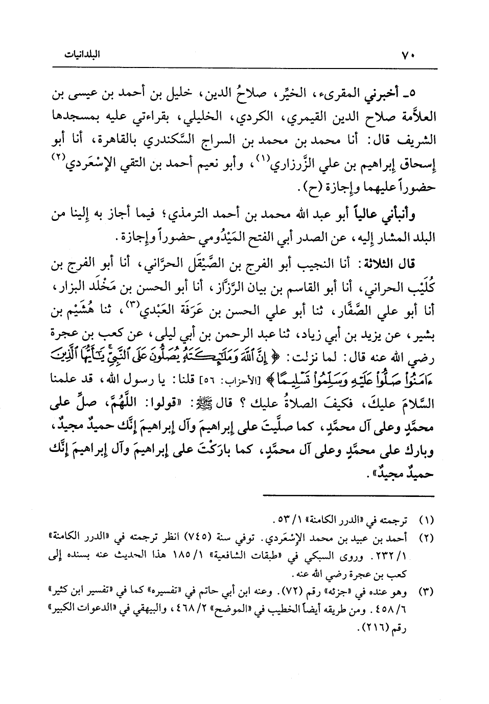 وَأَنْبَأَنِي عَالِيًا أَبُو عَبْدِ اللَّهِ مُحَمَّدُ بْنُ أَحْمَدَ التِّرْمِذِيُّ فِيمَا أَجَازَ بِهِ إِلَيْنَا مِنَ الْبَلَدِ الْمُشَارِ إِلَيْهِ عَنِ الصَّدْرِ أَبِي الْفَتْحِ الْمَيْدُومِيُّ حُضُورًا وَإِجَازَةً قَالَ الثَّلاثَةُ أَنا النَّجِيبُ أَبُو الْفَرَجِ بْنُ الصَّيْقَلِ الْحَرَّانِيُّ أَنا أَبُو الْفَرَجِ بْنِ كُلَيْبٍ الْحَرَّانِيُّ أَنا أَبُو الْقَاسِمِ بْنُ بَيَانٍ الرَّزَّازُ أَنا أَبُو الْحَسَنِ بْنُ مَخْلَدٍ الْبَزَّارُ أَنا أَبُو عَلِيٍّ الصَّفَّارُ ثَنَا أَبُو عَلِيٍّ الْحَسَنُ بْنُ عَرَفَةَ الْعَبْدِيُّ ثَنَا هُشَيْمُ بْنُ بَشِيرٍ عَنْ يَزِيدَ بْنِ أَبِي زِيَادٍ ثَنَا عَبْدُ الرَّحْمَنِ بْنُ أَبِي لَيْلَى عَنْ كَعْبِ بْنِ عُجْرَةَ رَضِيَ اللَّهُ عَنْهُ قَالَ لَمَّا نَزَلَتْ (إِنَّ اللَّهَ وَمَلائِكَتَهُ يُصَلُّونَ عَلَى النَّبِيِّ ياأيها الَّذين ءامنوا صَلُّوا عَلَيْهِ وَسَلِّمُوا تَسْلِيمًا) الْأَحْزَاب 56 قُلْنَا يَا رَسُولَ اللَّهِ قَدْ عَلِمْنَا السَّلامَ عَلَيْكَ فَكَيْفَ الصَّلاةُ عَلَيْكَ قَالَ {صَلَّى اللَّهُ عَلَيْهِ وَسَلَّمَ} قُولُوا اللَّهُمَّ صَلِّ عَلَى مُحَمَّدٍ وَعَلَى آلِ مُحَمَّدٍ كَمَا صليت على إِبْرَاهِيم وعَلى آل إِبْرَاهِيمَ إِنَّكَ حَمِيدٌ مَجِيدٌ وَبَارِكْ عَلَى مُحَمَّدٍ وَعَلَى آلِ مُحَمَّدٍ كَمَا باركت على إِبْرَاهِيم وعَلى آل إِبْرَاهِيمَ إِنَّكَ حَمِيدٌ مَجِيدٌ