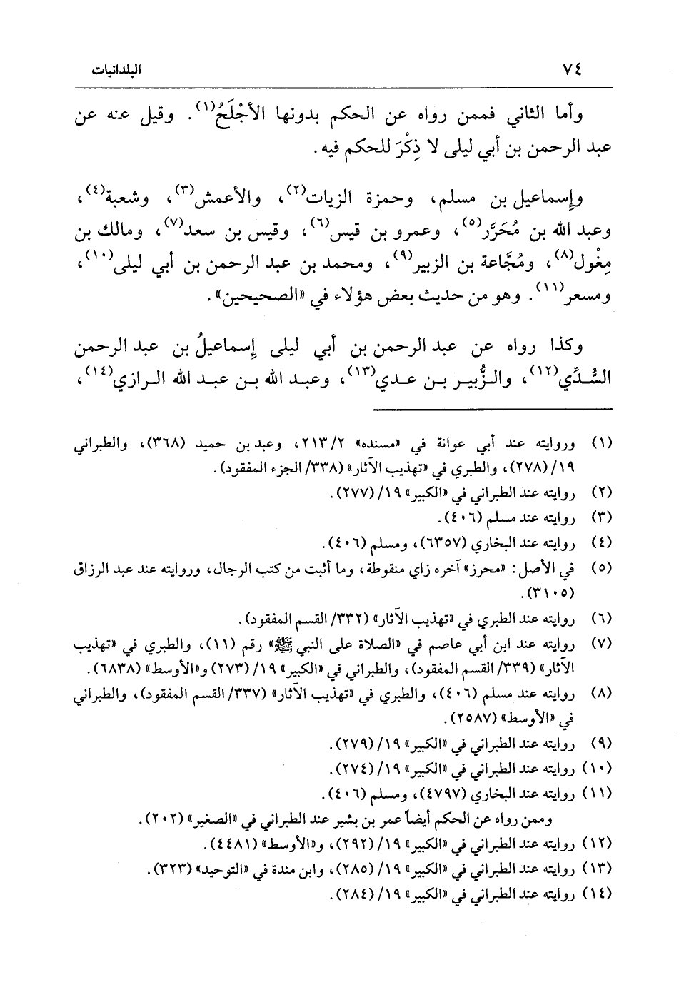 وَأَمَّا الثَّانِي فَمِمَّنْ رَوَاهُ عَنِ الحكم بِدُونِهَا الْأَجْلَح وَقيل عَنْهُ عَنْ عَبْد الرَّحْمَنِ بْن أَبِي ليلى لَا ذكر للْحكم فِيهِ وَإِسْمَاعِيل بْن مُسْلِم وَحَمْزَة الزيات والأَعْمَش وَشعْبَة وَعبد اللَّه بْن مُحَرر وَعَمْرو بْن قيس وَقيس بْن سَعْد وَمَالِك بْن مغول ومجاعة بْن الزُّبَيْر وَمُحَمّد بْن عَبْدُ الرَّحْمَنِ بْنُ أَبِي لَيْلَى ومسعر وَهُوَ من حَدِيث بَعْض هَؤُلَاءِ فِي الصَّحِيحَيْنِ وَكَذَا رَوَاهُ عَنْ عَبْد الرَّحْمَنِ بْن أَبِي ليلى إِسْمَاعِيل بْن عَبْد الرَّحْمَنِ السّديّ وَالزُّبَيْر بْن عدي وَعبد اللَّه بْن عَبْد اللَّهِ الرَّازِيّ