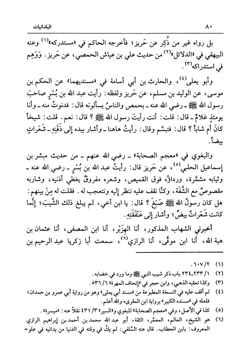 بَل رَوَاهُ غَيْر من ذكر عَنْ حريز فَأخْرجهُ الْحَاكِم فِي مُسْتَدْركه وَعنهُ الْبَيْهَقِيّ فِي الدَّلَائِل من حَدِيث عَلِي بْن عَيَّاش الْحِمصِي عَنْ حريز وَوهم فِي استدراكه وَأَبُو يعلى والْحَارث بْن أبي أُسَامَة فِي مسنديهما عَنْ الحكم بْن مُوسَى عَنْ الْوَلِيد بْن مُسْلِم عَنْ حريز وَلَفظه رَأَيْت عَبْد اللَّهِ بْن بسر صَاحب رَسُول اللَّهِ {صَلَّى اللَّهُ عَلَيْهِ وَسَلَّمَ} - رَضِيَ اللَّهُ عَنْهُ - بحمص وَالنَّاس يسألونه قَالَ فدنوت مِنْهُ - وَأَنا يَوْمئِذٍ غُلَام - قَالَ قُلْت أَنْتَ رَأَيْت رَسُول اللَّهِ {صَلَّى اللَّهُ عَلَيْهِ وَسَلَّمَ} قَالَ نعم قُلْت شَيخا كَانَ أم شَابًّا قَالَ فَتَبَسَّمَ وَقَالَ رَأَيْت هَاهُنَا - وَأَشَارَ بِيَدِهِ إِلَى ذقنه - شَعرَات بيضًا وَالْبَغوِيّ فِي مُعْجم الصَّحَابَة - رَضِيَ اللَّهُ عَنْهُم - من حَدِيث مُبشر بْن إِسْمَاعِيل الْحلَبِي عَنْ حريز قَالَ رَأَيْت عَبْد اللَّهِ بْنَ بُسْرٍ - رَضِيَ اللَّهُ عَنْهُ - وثيابه مشمرة وَرِدَاؤُهُ فَوْقَ الْقَمِيص وشعره مفروق يُغطي أُذُنَيْهِ وشاربه مقصوص مَعَ الشّفة وَكُنَّا نقف عَلَيْهِ نَنْظُر إِلَيْهِ ونتعجب لَهُ فَقُلْتُ لَهُ من بَينهم هَل كَانَ رَسُولُ اللَّهِ {صَلَّى اللَّهُ عَلَيْهِ وَسَلَّمَ} صبغ قَالَ يَا ابْن أخي لَمْ يبلغ ذَلِكَ الشيب إِنَّمَا كَانَت شَعرَات بيض وَأَشَارَ إِلَى عنفقته
