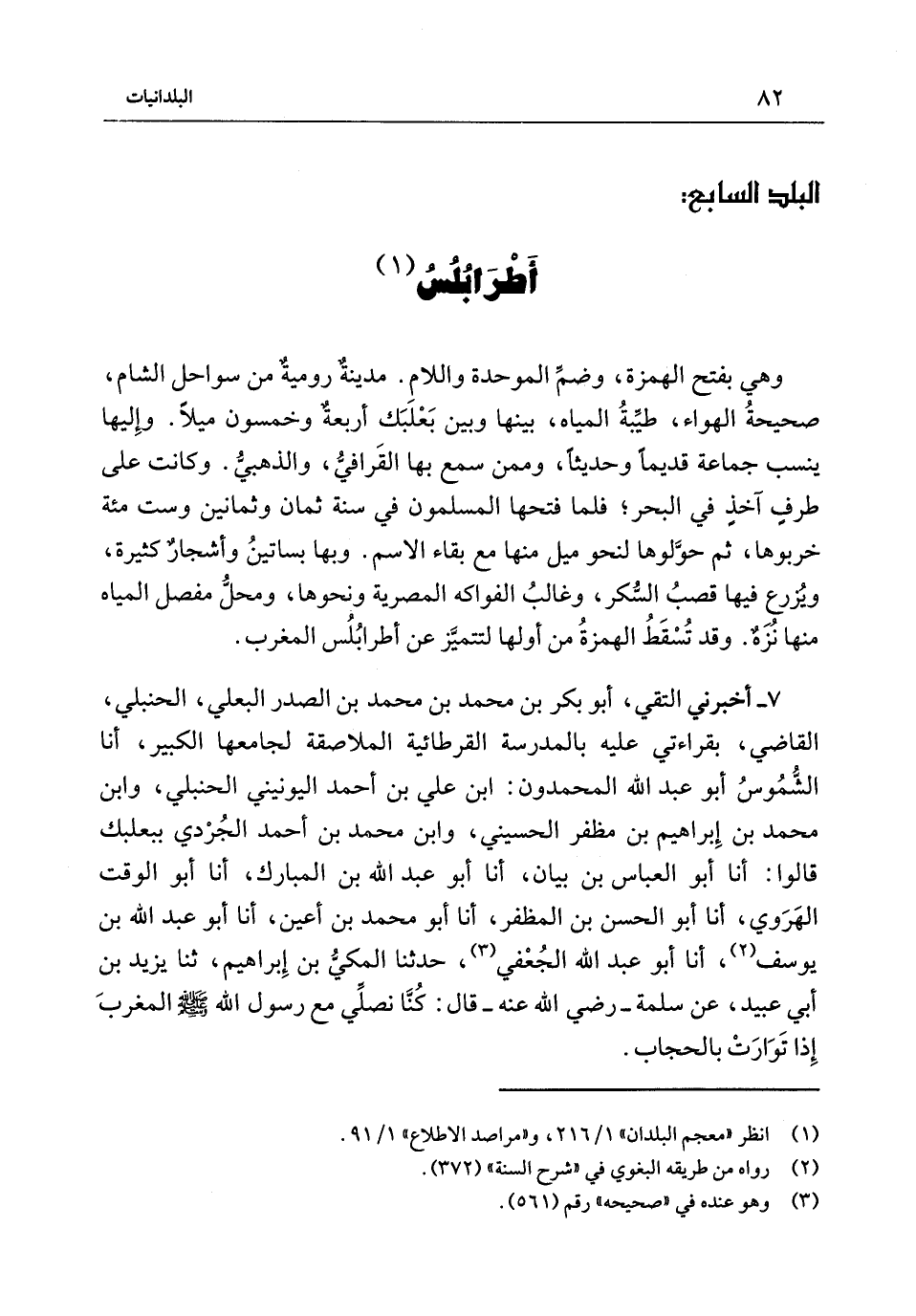 وَهِيَ بِفَتْح الْهمزَة وَضم الْمُوَحدَة وَاللَّام مَدِينَة رُومِية من سواحل الشَّام صَحِيحَة الْهَوَاء طيبَة الْمِيَاه بَينهَا وَبَين بعلبك أَرْبَعَة وَخَمْسُونَ ميلًا وإليها ينْسب جَمَاعَة قَدِيما وحَدِيثا وَمِمَّنْ سمع بهَا الْقَرَافِيّ والذهبي وَكَانَت عَلَى طرف آخذ فِي الْبَحْر فَلَمَّا فتحهَا الْمُسلمُونَ فِي سنة ثَمَان وَثَمَانِينَ وست مئة خربوها ثُمَّ حولوها لنَحْو ميل مِنْهَا مَعَ بَقَاء الِاسْم وَبهَا بساتين وأشجار كَثِيرَة ويزرع فِيهَا قصب السكر وغالب الْفَوَاكِه المصرية وَنَحْوهَا وَمحل مفصل الْمِيَاه مِنْهَا نزه وَقَدْ تسْقط الْهمزَة من أَولهَا لتتميز عَنْ أطرابلس الْمغرب