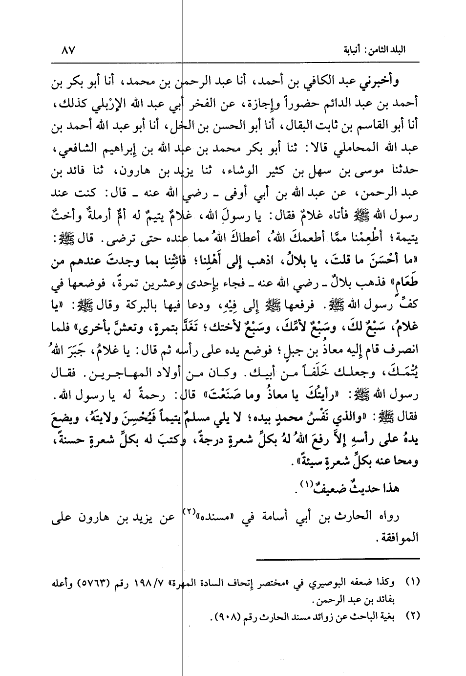 وَأَخْبَرَنِي عَبْدُ الْكَافِي بْنُ أَحْمَدَ أَنا عَبْدُ الرَّحْمَنِ بْنُ مُحَمَّدِ أَنا أَبُو بَكْرِ بْنُ أَحْمَدَ بْنِ عَبْدِ الدَّائِمِ حُضُورًا وَإِجَازَةً عَن الْفَخر بن أَبِي عَبْدِ اللَّهِ الإِرْبِلِيِّ كَذَلِكَ أَنا أَبُو الْقَاسِمِ بْنُ ثَابِتٍ الْبَقَّالُ أَنا أَبُو الْحَسَنِ بْنُ الْخلِ أَنا أَبُو عَبْدِ اللَّهِ أَحْمَدُ بْنُ عَبْدِ اللَّهِ الْمَحَامِلِيُّ قَالا ثَنَا أَبُو بَكْرٍ مُحَمَّدُ بْنُ عَبْدِ اللَّهِ بْنِ إِبْرَاهِيمَ الشَّافِعِيُّ حَدَّثَنَا مُوسَى بْنُ سَهْلِ بْنِ كَثِيرٍ الْوَشَّاءُ ثَنَا يَزِيدُ بْنُ هَارُونَ ثَنَا فَائِدُ بْنُ عَبْدِ الرَّحْمَنِ عَنْ عَبْدِ اللَّهِ بْنِ أَبِي أَوْفَى - رَضِيَ اللَّهُ عَنْهُ - قَالَ كُنْتُ عِنْدَ رَسُولِ اللَّهَ {صَلَّى اللَّهُ عَلَيْهِ وَسَلَّمَ} فَأَتَاهُ غُلَام فَقَالَ يارسول اللَّهِ غُلامٌ يَتِيمٌ لَهُ أُمٌّ أَرْمَلَةٌ وَأُخْتٌ يَتِيمَةٌ أَطْعِمْنَا مِمَّا أَطْعَمَكَ اللَّهُ أَعْطَاكَ اللَّهُ مِمَّا عِنْدَهُ حَتَّى تَرْضَى قَالَ {صَلَّى اللَّهُ عَلَيْهِ وَسَلَّمَ} مَا أَحْسَنَ مَا قُلْتَ يَا بِلالُ اذْهَبْ إِلَى أَهْلِنَا فَائْتِنَا بِمَا وَجَدْتَ عِنْدَهُمْ مِنْ طَعَامٍ فَذَهَبَ بِلالٌ - رَضِيَ اللَّهُ عَنْهُ - فَجَاءَ بِإِحْدَى وَعِشْرِينَ تَمْرَةً فَوَضَعَهَا فِي كَفِّ رَسُولَ اللَّهَ {صَلَّى اللَّهُ عَلَيْهِ وَسَلَّمَ} فَرَفَعَهَا {صَلَّى اللَّهُ عَلَيْهِ وَسَلَّمَ} إِلَى فِيهِ وَدَعَا فِيهَا بِالْبَرَكَةِ وَقَالَ {صَلَّى اللَّهُ عَلَيْهِ وَسَلَّمَ} يَا غُلامُ سَبْعٌ لَكَ وَسَبْعٌ لأُمِّكَ وَسَبْعٌ لأُخْتِكَ تَغَدَّ بِتَمْرَةٍ وَتَعَشَّ بِأُخْرَى فَلَمَّا انْصَرَفَ قَامَ إِلَيْهِ مُعَاذُ بْنُ جَبْلٍ فَوَضَعَ يَدَهُ عَلَى رَأْسِهِ ثُمَّ قَالَ يَا غُلامُ جَبَرَ اللَّهُ يُتْمَكَ وَجَعَلَكَ خَلَفًا مِنْ أَبِيكَ وَكَانَ مِنْ أَوْلادِ الْمُهَاجِرِينَ فَقَالَ رَسُولَ اللَّهَ {صَلَّى اللَّهُ عَلَيْهِ وَسَلَّمَ} رِأَيْتُكَ يَا مُعَاذَ وَمَا صَنَعْتَ قَالَ رَحْمَةٌ لَهُ يَا رَسُولَ اللَّهِ فَقَالَ {صَلَّى اللَّهُ عَلَيْهِ وَسَلَّمَ} وَالَّذِي نَفْسُ مُحَمَّدٍ بِيَدِهِ لَا يَلِي مُسْلِمٌ يَتِيمًا فَيُحْسِنُ وِلايَتَهُ وَيَضَعُ يَدَهُ عَلَى رَأَسْهِ إِلا رَفَعَ اللَّهُ لَهُ بِكُلِّ شَعْرَةٍ دَرَجَةً وَكَتَبَ لَهُ بِكُلِّ شَعْرَةٍ حَسَنَةً وَمَحَا عَنْهُ بِكُلِّ شَعْرَةٍ سَيِّئَةٍ هَذَا حَدِيثٌ ضَعِيفٌ رَوَاهُ الْحَارِثُ بْنُ أَبِي أُسَامَةَ فِي مُسْنَدِهِ عَنْ يَزِيدَ بْنِ هَارُونَ عَلِي الْمُوَافَقَةِ