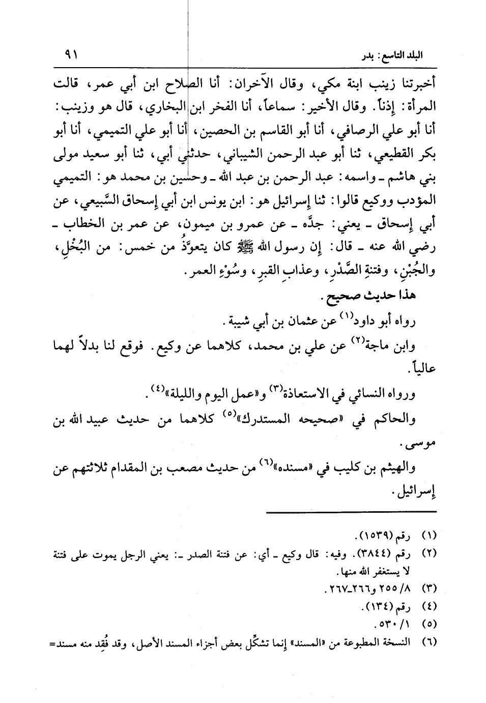أَخْبَرَتْنَا زَيْنَبُ ابْنَةُ مَكِّيٍّ وَقَالَ الْآخرَانِ أَنا الصّلاح ابْن أَبِي عُمَرَ قَالَتْ الْمَرْأَةُ إِذْنًا وَقَالَ الأَخِيرُ سَمَاعًا أَنا الْفَخْرُ ابْن الْبُخَارِيِّ قَالَ هُوَ وَزَيْنَبُ أَنا أَبُو عَلِيِّ الرُّصَافِيُّ أَنا أَبُو الْقَاسِمِ بْنُ الْحُصَيْنِ أَنا أَبُو عَلِيٍّ التَّمِيمِيُّ أَنا أَبُو بَكْرٍ الْقَطِيعِيُّ ثَنَا أَبُو عَبْدِ الرَّحْمَنِ الشَيْبَانِيُّ حَدَّثَنِي أَبِي ثَنَا أَبُو سَعِيدٍ مَوْلَى بَنِي هَاشِمٍ - وَاسْمُهُ عَبْد الرَّحْمَنِ بْن عَبْد اللَّهِ - وَحُسَيْنُ بْنُ مُحَمَّدٍ هُوَ التَّمِيمِيُّ الْمُؤَدِّبُ وَوَكِيعٌ قَالُوا ثَنَا إِسْرَائِيلُ هُوَ ابْن يُونُس ابْن أَبِي إِسْحَاقَ السَّبِيعِيُّ عَنْ أَبِي إِسْحَاقَ - يَعْنِي جَدَّهُ - عَنْ عَمْرِو بْنِ مَيْمُونٍ عَنْ عُمَرَ بْنِ الْخَطَّابِ - رَضِيَ اللَّهُ عَنْهُ - قَالَ أَنَّ رَسُولَ اللَّهَ {صَلَّى اللَّهُ عَلَيْهِ وَسَلَّمَ} كَانَ يَتَعَوَّذُ مِنْ خَمْسٍ مِنَ الْبُخْلِ وَالْجُبْنِ وَفِتْنَةِ الصَّدْرِ وَعَذَابِ الْقَبْرِ وَسُوءِ الْعُمْرِ هَذَا حَدِيثٌ صَحِيحٌ رَوَاهُ أَبُو دَاوُود عَنْ عُثْمَانَ بْنِ أَبِي شَيْبَةَ وَابْنُ مَاجَهْ عَنْ عَلِيِّ بْنِ مُحَمَّدٍ كِلاهُمَا عَنْ وَكِيعٍ فَوَقَعَ لَنَا بَدَلا لَهُمَا عَالِيًا وَرَوَاهُ النَّسَائِيّ فِي الِاسْتِعَاذَة وعمل الْيَوْم وَاللَّيْلَة وَالْحَاكِم فِي صَحِيحه الْمُسْتَدْرك كِلَاهُمَا من حَدِيث عُبَيْد اللَّهِ بْن مُوسَى والهيثم بْن كُلَيْب فِي مُسْنده من حَدِيث مُصْعَب بْن الْمِقْدَام ثَلَاثَتهمْ عَنْ إِسْرَائِيل